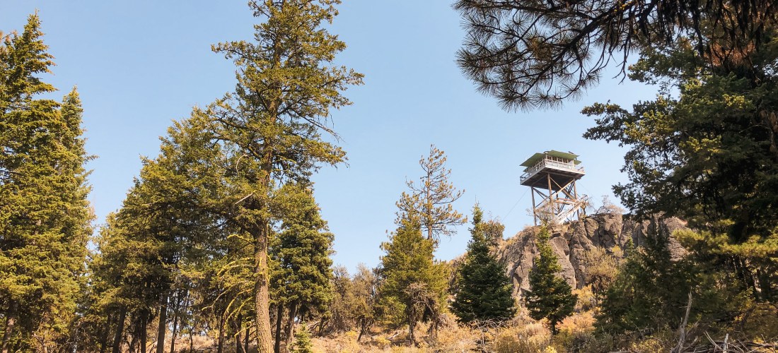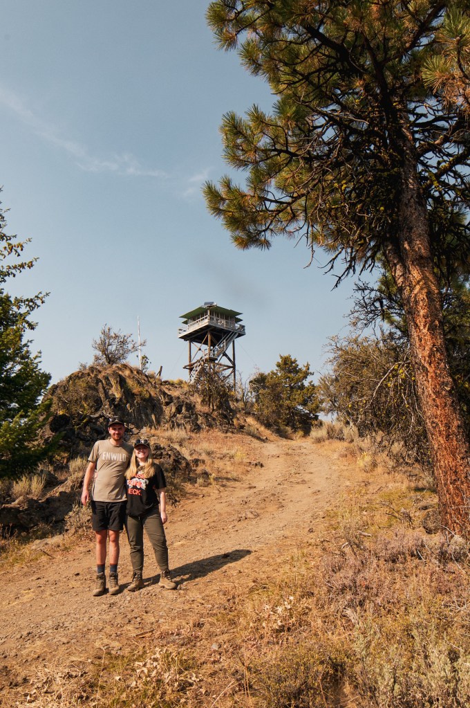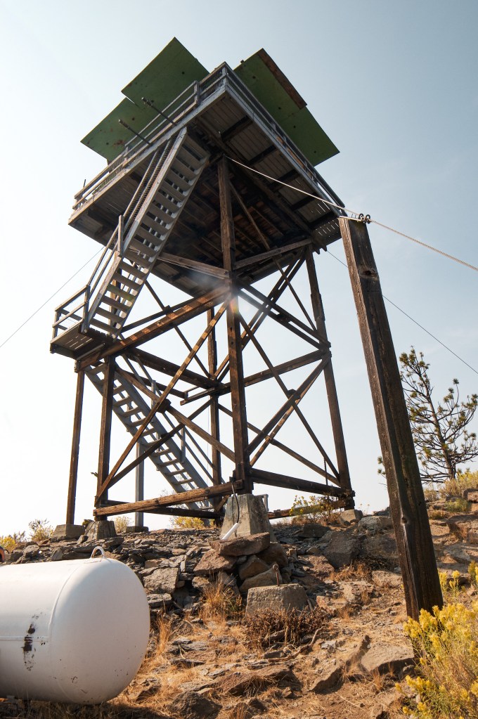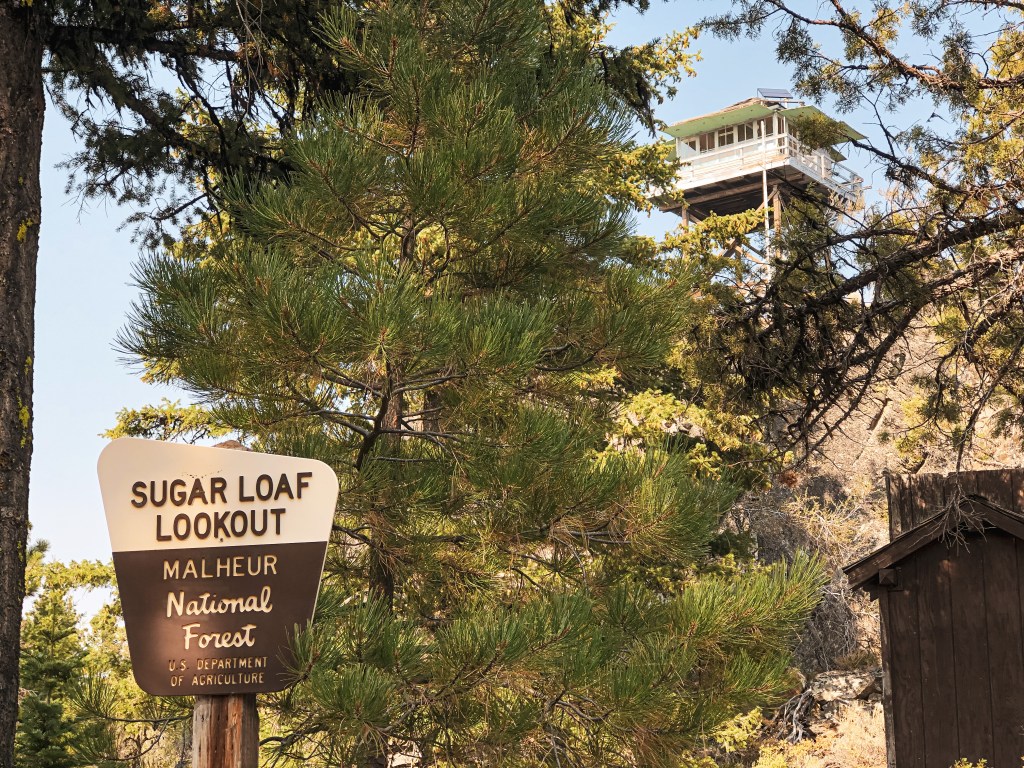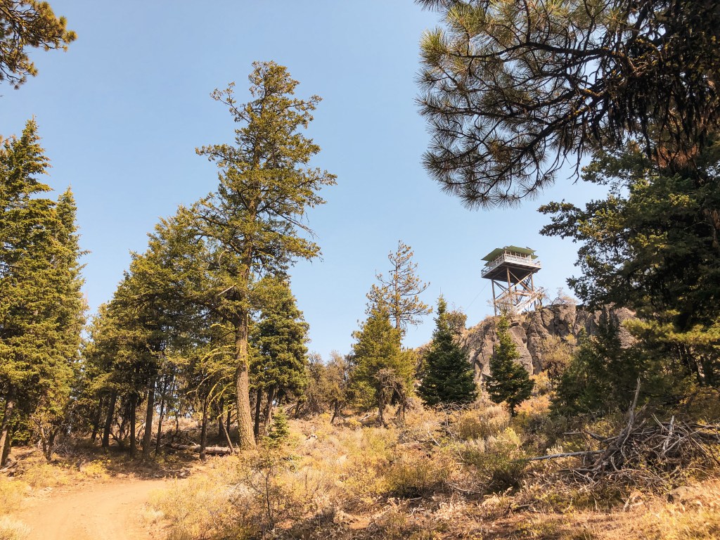 We decided we had enough time left in the day, after an easy visit to West Myrtle (post), to visit Sugarloaf Mountain as well. We drove back down NF-37 until we passed Yellowjacket Reservoir and reached the junction with NF-3740. NF-3740 has a sign that notes Sugarloaf Mountain L.O. as 5 miles away. The road was basically graded over a scab which made it a bumpy 5 miles to the gate of the lookout. It wasn’t a great road to drive on but passable to my Civic with caution. We parked near the gate and hiked the remaining 0.64 miles to the summit. There was a Forest Service vehicle parked at the top and we were greeted by the fill-in lookout attendant a few minutes later. She was very friendly and chatted with us for 30 minutes before returning to work. She said she’d been serving in that role for the past 30 years. She had previously worked at King Mountain (post) and Dry Mountain (post), but Sugarloaf Mountain was her favorite by far. She hoped that once she retired the Forest Service would let her continue to be the fill-in there on the weekends. She was disappointed there wasn’t a clearer view to show off the forest to us. She also mentioned it made her sad that she had to close the gate to the lookout. You could tell she enjoyed interacting with people and sharing her love of the forest with them. Unfortunately, we forgot to catch her name or what kind of work she does for the Forest Service during the week. We didn’t get invited up to check out the cab, but we assumed this was due to COVID-19 precautions given some comments she made during our visit. We enjoyed lunch at the picnic table below the lookout before heading back down the road. As we took a last look from the road, the lookout attendant came out to give us a parting wave and good-bye.