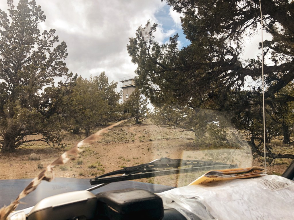 A fortress. A tower for a high-security prison. The tower that kept Rapunzel locked away. The current structure on Green Mountain hardly resembles what we would typically recognize as a fire lookout. The 50′ enclosed cinder block tower with observation cab was built in 2010. This lookout was funded by the American Recovery and Reinvestment Act of 2009. The recovery work consisted of demolishing the existing lookout, building the new lookout, and associated site work. The original 2-story lookout was built in 1963 with a 10′ concrete base and wooden live in cab.