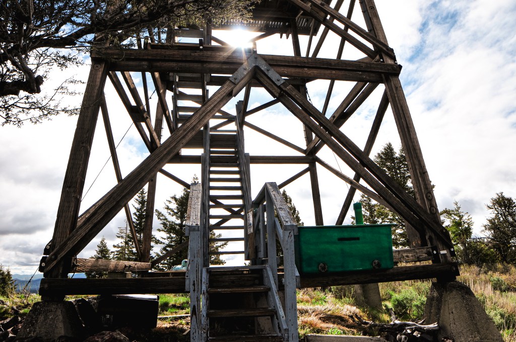 We were surprised to see an SUV driving down the road when were parking to walk. We’ve hardly ever ran into anyone else while visiting fire lookouts unless they are off of a hiking trail or actively staffed. It was also still relatively early in the morning, we were on the summit before 9AM. Besides Steliko Point L.O. (post), where we were physically staying in the lookout, this is probably the earliest we’ve been able to reach a fire lookout. It looked like the Forest Service had been up here recently prepping the lookout for the season. The shutters had been removed and were still on the catwalk. A ladder was also on the catwalk to gain access to the solar panel. Antelope Mountain is quite a ways out there, you can even see the edge of where the forest ends from the summit. We appreciated the nice break in weather that provided some decent views, but didn’t stay too long. We wanted to head on to Crane Point (post) before anymore clouds rolled in for the day.