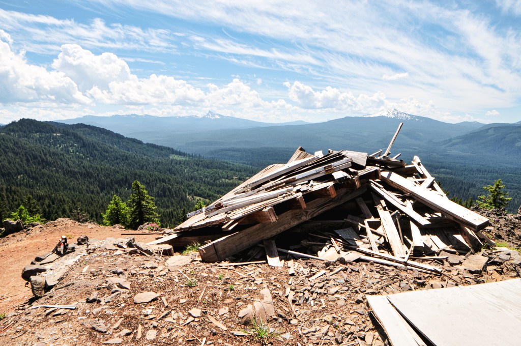 The Manzanita and Ceanothus were encroaching on the road in some portions and there were a couple down trees, but otherwise it wasn’t in terrible shape. There was a point in the road where it opened up to a view of what we assumed to be Watson Butte. I could see signs of a structure, but it was hard to tell exactly what I was looking at from that distance. I thought it looked collapsed, but I was hopeful my view was just obstructed. We walked for about a mile until we came to the trailhead. There is still a sign noting where the Watson Butte Trail #1443 starts. There was even enough room for a couple cars to park. It is obvious that this trail doesn’t see much use. From the trailhead, it is another 1.1 miles to the summit gaining around 600′ in elevation. We started out by following an old decommissioned road bed until it met with the base of the butte. The trail started to gain more elevation once we left the road. The trail continues faintly through a mostly shaded forest. It was especially faint among the switchbacks. We were able to stay on track by looking for the trail bench in the more overgrown sections. The final push is steep, but eventually opens up to an exposed summit. My partner had made it to the summit before me and I called out to ask if it was still there. He was oddly quiet in response. Eventually, I rounded the corner and saw why. We were too late. We had known Watson Butte L.O. was in bad shape and had been for years, which is why it was on our priority list to visit. There were posts of it standing the year before and we thought we had time. But, we were still too late. Watson Butte L.O. was nothing more than a pile of boards.