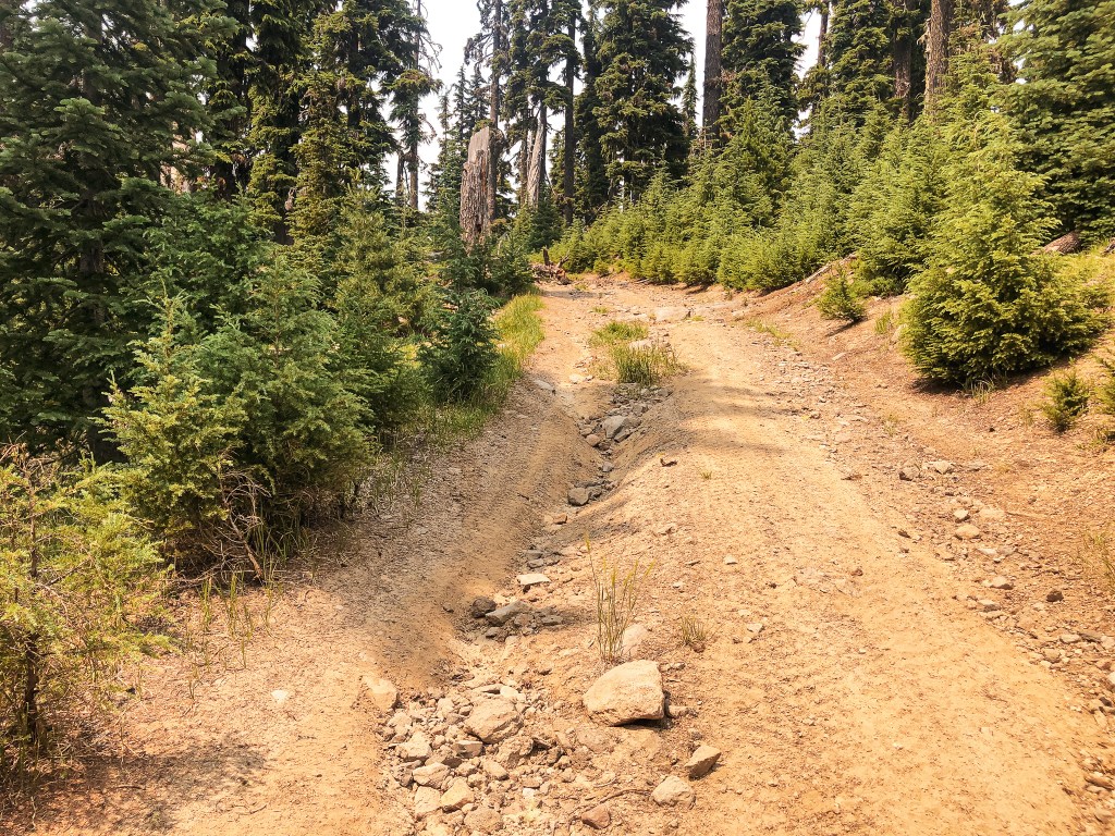 Our alarms were set for 6AM and we were on the road as early as possible. We headed down the I-5 corridor once more, but this time cut over on HWY-58 to meet up with HWY-97. We gave a quick wave to Odell Butte L.O. and Walker Mountain L.O. (post) as we drove past their marked highway turn offs. After a quick refuel in our now frequented stop in Chemult, we turned on to HWY-138 towards Crater and Diamond Lake. We passed the north entrance to Crater Lake NP and stayed on HWY-138 until we reached the turn for HWY-230 off to the left. I have been through this area a few times now on various different trips throughout the years. We were also familiar with the route due to an unsuccessful attempt of Garwood during our visit to Cinnamon Butte (post) last December. From HWY-230, we turned right at the access for Three Lakes Sno-Park. We continued straight to stay on NF-3703 until we reached the turn off for NF-370 spur. There were minimal potholes and ruts to avoid along the NF-3703 road. We didn’t even have to attempt a drive up the NF-370 spur to see it wasn’t a drive-able road. There were large ruts and rocks embedded in it that were not low-clearance compatible. The road is marked but the sign is sun-bleached and indecipherable. It is best identified by its terrible condition and a ski post marked with the number 36. We parked in a pull out just past the road. It was already noon by the time we got there, so we decided to have lunch in the comforts of our air conditioned car instead of the summit. While we were hiding out in the car, an ATV came brapping by and waited at the NF-370 junction. At first, we were confused on what they were doing or thought maybe they stopped because they were confused by what we were doing. But then, another ATV followed which triggered the first one to head up the road. When the second ATV reached the junction it proceeded to wait as well. The same thing continued to repeat itself until 8 ATVs had turned up the NF-370 spur. We weren’t too keen on starting a road walk that we knew would end in us being dusted up and decided to wait. The road eventually just dead ends and they would have to come back down. Luckily, we didn’t have to wait long and their brapping continued on to somewhere else.