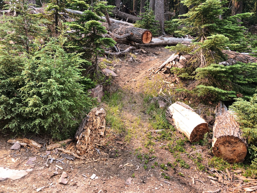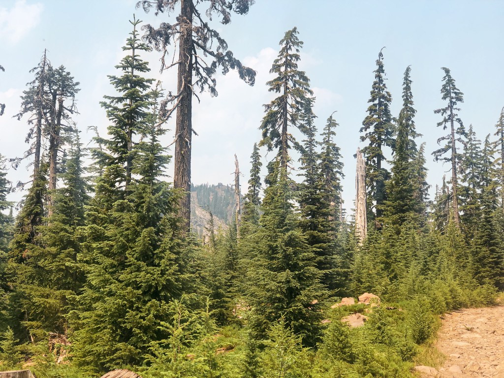 It was hot and dusty when we started our hike up the road. We knew it was roughly two miles to the Fire Lookout from the junction, if you stayed on the road and didn’t use the connector trail. As we walked along, the road conditions continued to deteriorate with larger embedded rocks, downed trees, and wash out. There was a point in the road where the ATVs even turned around. A large tree had come down across it and there wasn’t enough room on either side for them to get around. Ah, that’s why they didn’t take long. It would have required a chain saw to remove it. We both agreed, this was officially the worst road we’ve been on so far. I took some pictures of the road, but it never quite captures the true conditions. We eventually reached a more open area with a view of Garwood Butte. There was a defined trail off to the left that we assumed was the connector trail. A peakbagger report had mentioned this trail was no longer here in 2012, but from what we could see it was now. If you take this trail you can cut off a half of a mile of road walking. It meets back up with the road where the official trail #1471 to Garwood Butte begins. There is no official trail sign, but it was a well defined junction. If you have trouble finding it, always look for the cut logs first. As we headed up the trail, it appeared to have been brushed out more recently. It was clear to us that someone had been taking care of this route somewhat regularly despite the road conditions. It was a hot and slightly humid slog to the summit. The trail switch-backed through an interestingly mixed forest until it opened up to an exposed slope. The trail was in great condition besides a few loose sections that made finding my footing more difficult.