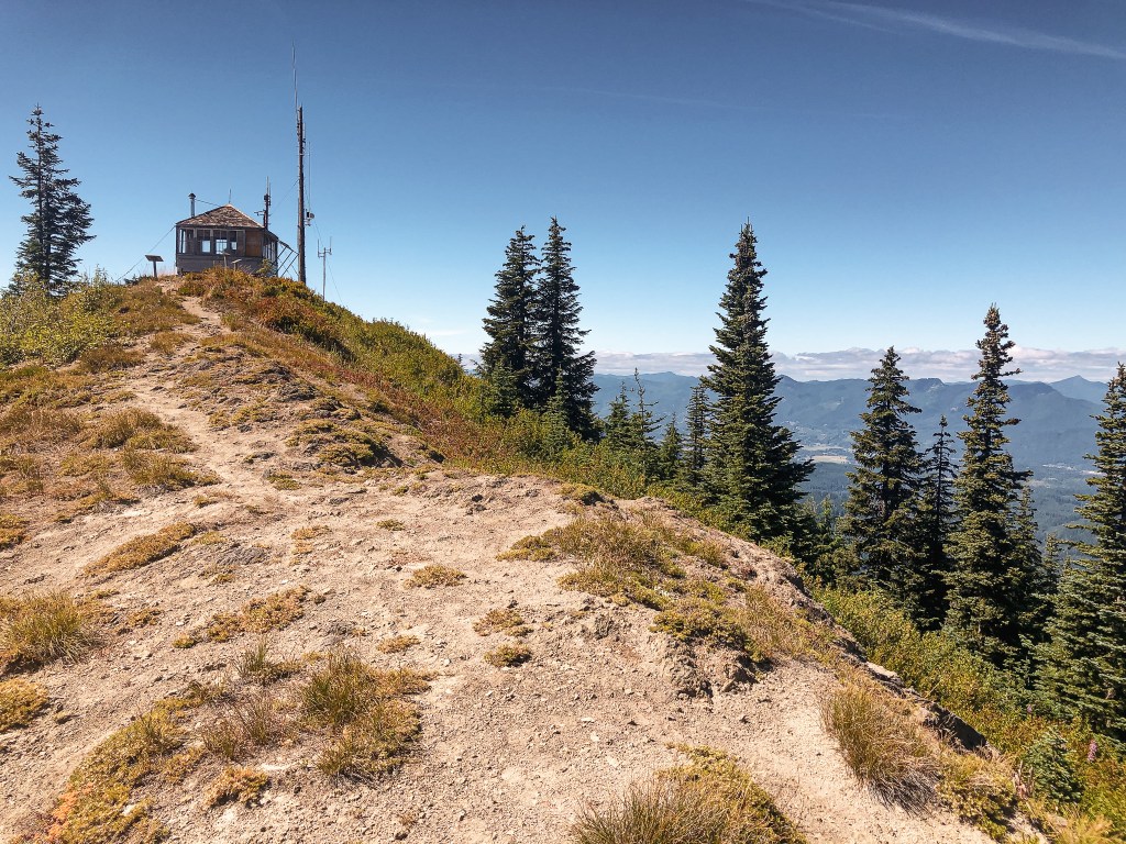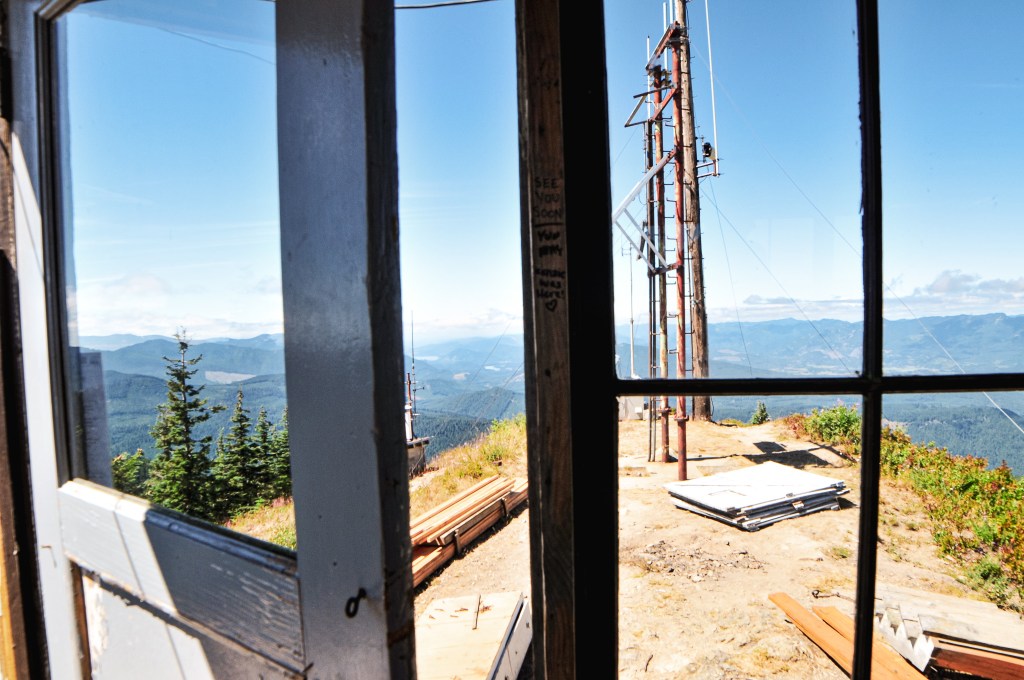 The final mile to Burley Mountain was hot, dusty, and exposed. It’s a narrow road with steep drop offs and is fairly busy to vehicle traffic. I would proceed with caution if you decide to drive the road. There is no where to pass on certain sections if you meet oncoming traffic. There was a dirt bike and truck heading down as we were walking up. The only people on the summit when we arrived was an older couple from Nevada that had parked in the lower pull out. We briefly spoke to them because they had initially been trying to find the alternate trail to Angel Falls. This is a hike that starts at the trailhead by the Cispus Learning Center. They had heard the bridges were washed out and wanted to try from the Burley Trailhead. Instead, they had accidentally ended up all the way up here after following their GPS. I’m not sure if by Burley Trailhead they meant where the trail meets up with NF-7605. But, if they did, it would have been a long and steep hike down to the waterfall. I asked if it wasn’t a ford-able creek, but it sounded like they only read online about the bridge washouts and didn’t check it out for themselves. We couldn’t offer them much more information than that since we walked the road instead of the trail. We wished them luck as they headed back to their truck and we continued to check out the lookout.