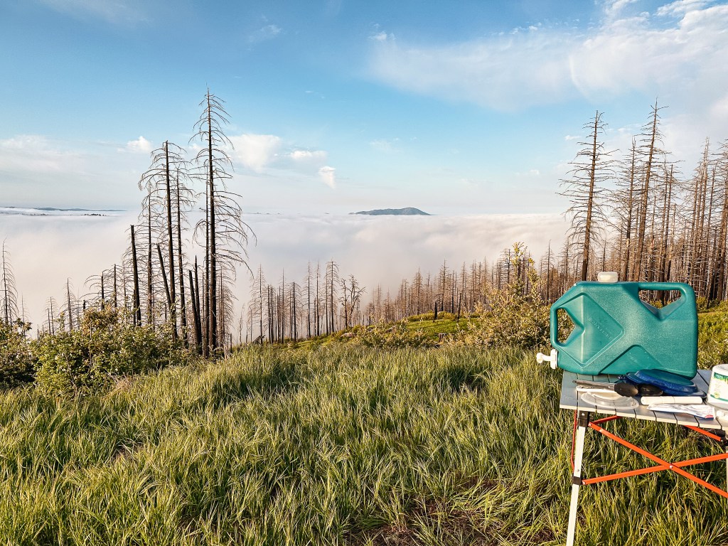 The area had been burned over a while back which opened up the views from the summit and road. You are mostly overlooking the peaks of the Kalmiopsis Wilderness. We could even spot Pearsoll Peak in the distance. Unfortunately, it was already late in the day when we arrived which gave us little time to explore. We briefly debated just camping on the summit since there were no official dispersed camp spots along the road. That was one down fall we encountered all weekend, the camp spots seem to be few and far between in the coastal range unless it was an established campground. The peaks might not be that high here, but you still have to climb up from sea level which leaves little flat areas to camp. We ultimately decided not to camp on the summit since there was a nice grassy landing a few miles below that I preferred instead. A cloud inversion started to roll in around sunset and stayed through the night into the late morning. It was gorgeous!