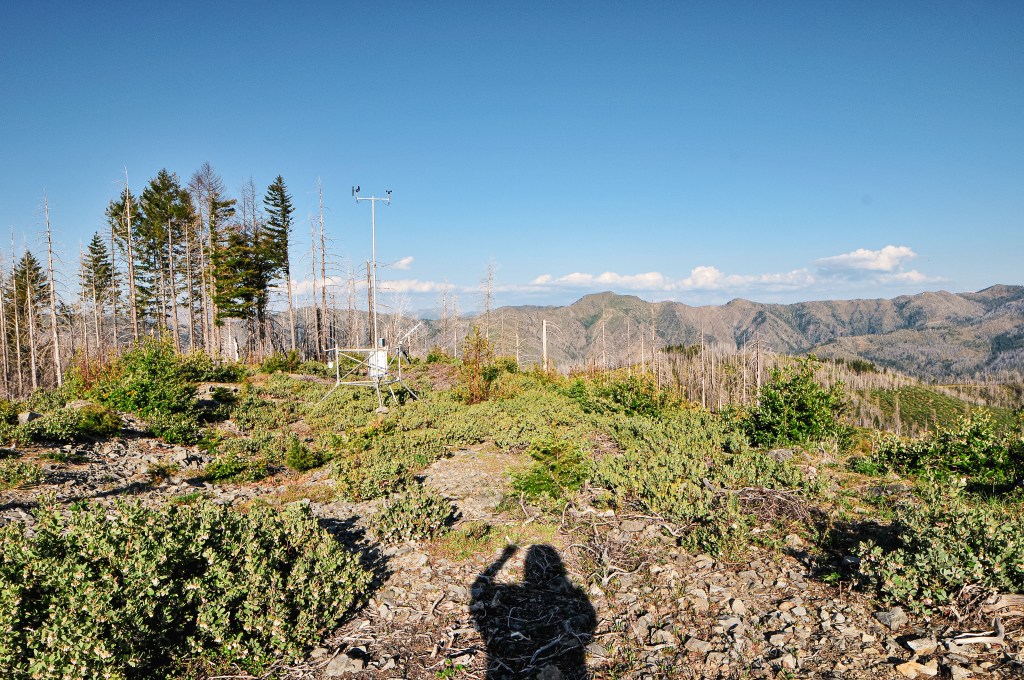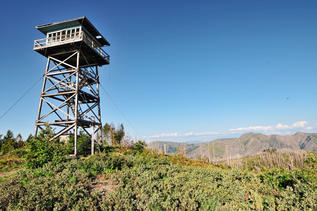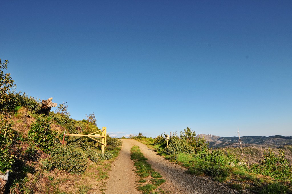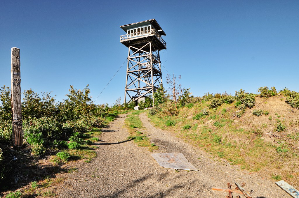 We headed back out on HWY-101 continuing south to Brookings. We wanted to start with the southern most fire lookout and slowly work our way back north to set us up for a shorter drive home. From Brookings, we turned left onto the N Bank Chetco River Road to head into the forest. This is a narrow paved road that winds along the edge of the Chetco River with steep drop offs as the ranger had mentioned. There were a few gravel bar campgrounds along this route that were filled to the brim with campers. The pavement was in good shape minus one spot before the last campground that drops down due erosion. If you’re not careful you could bottom out. We were able to crawl over this at an angle and others had driven their trailers beyond this section. After passing the last campground, we crossed the South Fork of the Chetco River on a single lane bridge and came to a T-junction. We turned left onto NF-1376 and the pavement ended. We weren’t on this road for very long before we came to a major fork. The NF-1376 road continues to the left along the Chetco River, but we turned right to start our climb up NF-1917. Shortly after starting up this road, I let Garnet take over the driving when the road made a dip on a narrow section. No use in wasting our time having me freak out while driving. The NF-1917 road climbs up along Long Ridge and past the Packer’s Cabin. As we got closer to the summit, there were some downed trees along the road. Luckily, the wood cutters had been through here and cleared just enough room for us to make it around. The spur road NF-180 for the lookout will be obvious since there is a gate and you can see the tower from the road. The road continues past the spur but turns into an unmaintained jeep track from there. We parked at the junction and decided to walk the remaining distance. The Strava App tracked the road walk at a little under half of a mile to the summit. The gate was open and we probably could have driven the Civic up, but we were both ready to stretch our legs after a full day in the car. The roads getting here had been decent with a bit of caution needed over a few bumps and dips.