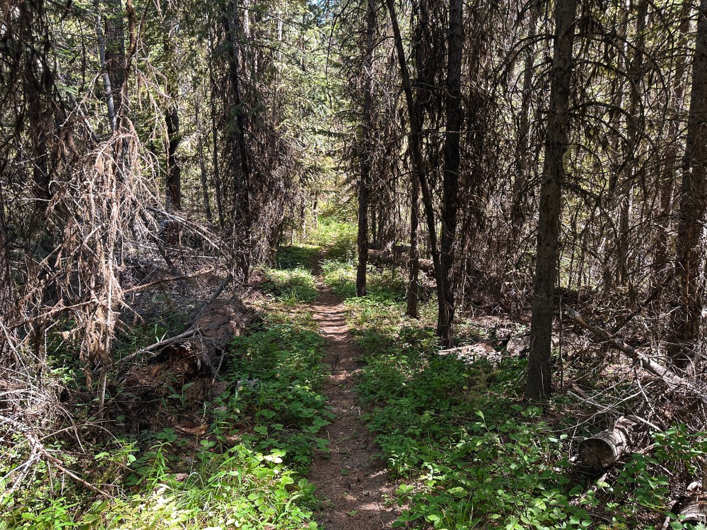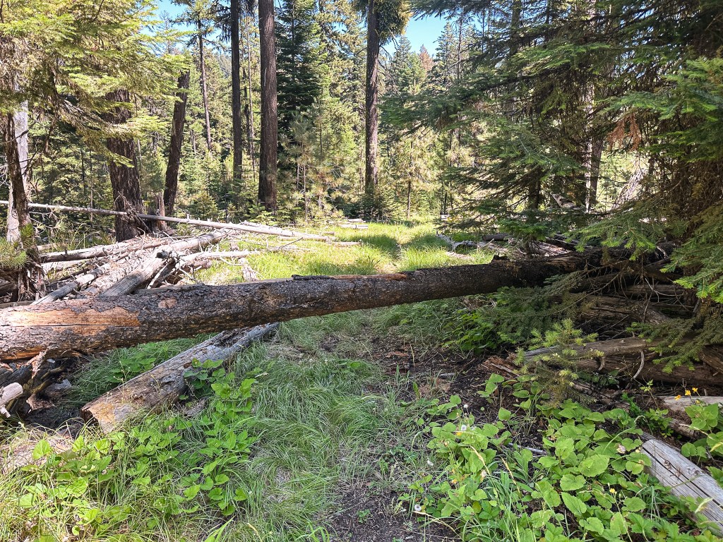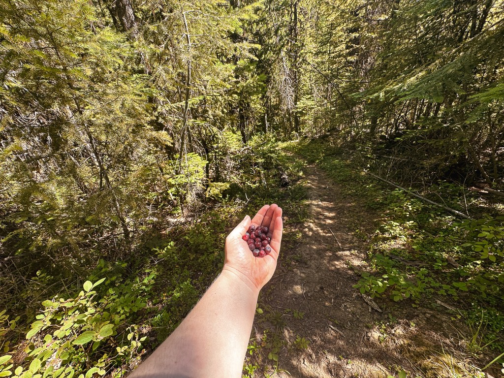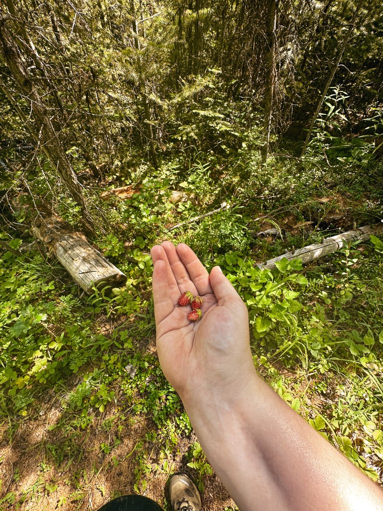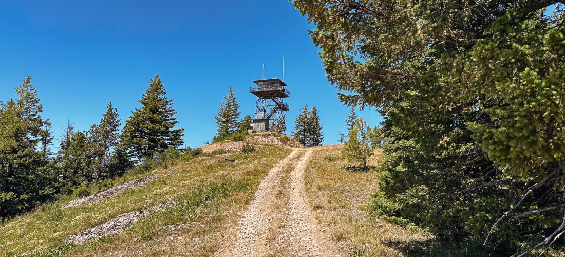 The heat was starting to get to me and I couldn’t seem to keep up on my water intake. The trail had varied between shaded forest and exposed slopes with tall grass. It was faint in some sections with a bit of blow down, but we never had any trouble staying on track. There were white markers in the trees to help. I wouldn’t classify it as a lost trail yet, but it definitely doesn’t see a lot of foot traffic. The tall grass also really aggravated my allergies and had me sniffling the majority of the way. Despite the ups and downs, the grass allergies, and the heat we were constantly rewarded with huckleberries and wild strawberries along the way. This helped to keep us motivated. On a small section of road just below the lookout there were tons of butterflies enjoying the flowers. I had never seen so many in an area all at once. This trail had a lot of fun surprises that I didn’t expect.