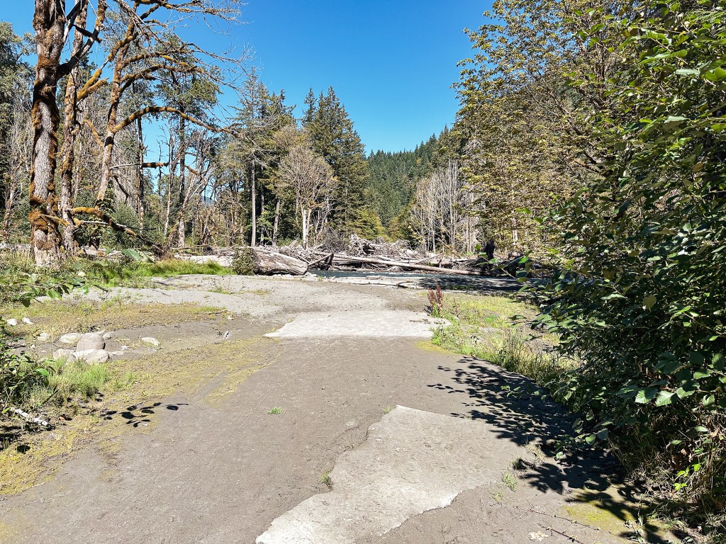 The “hike” starts beyond the gate along the Olympic Hot Springs road. This portion is on pavement until you reach the Bypass Trail that circumvents the road wash out. It was a surprisingly steep little trail as it directs you up and away from the road before dropping back down. This section can be challenging for those trying to bike the road. Once off the Bypass Trail it was back to pavement until I reached the old Elwha Ranger Station. The ranger station is located 2-1/2 miles from the trailhead and makes a good turn around point for day hikers. It is an interesting collection of buildings that are starting to show signs of neglect. It seems this area has been mostly abandoned by the parks service after the road washed out. I met where the road forks just beyond the station and continued left to turn onto the Whiskey Bend road. The paved Olympic Hot Springs road continues further to the right to access different areas within the park. The road walking turns to gravel from this junction to the trailhead. It was another 4-1/2 miles along this road. I had been hiking ahead of Garnet at this point, but I was slightly worried he might not notice the road turn off. There was a sign but it was mostly worn down and unreadable. I waited for a bit near the junction until I saw him heading up the road. From there, he caught up to me quickly. My legs were feeling good at this point and for once we were able to keep a similar pace. We stopped briefly to check out the remains of the Elwha Dam that had been removed in 2011-2012 to help restore the river. I’m pretty sure this is what eventually led to the road being washed out. The gravel road was mostly in good condition minus one or two parts that have sunk down. Something to note if they do manage to reconstruct the Olympic Hot Springs road in the future. There were some signs of construction along the bypass trail that suggested it might be in progress, but I haven’t done any additional research to confirm.