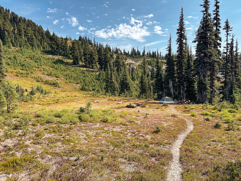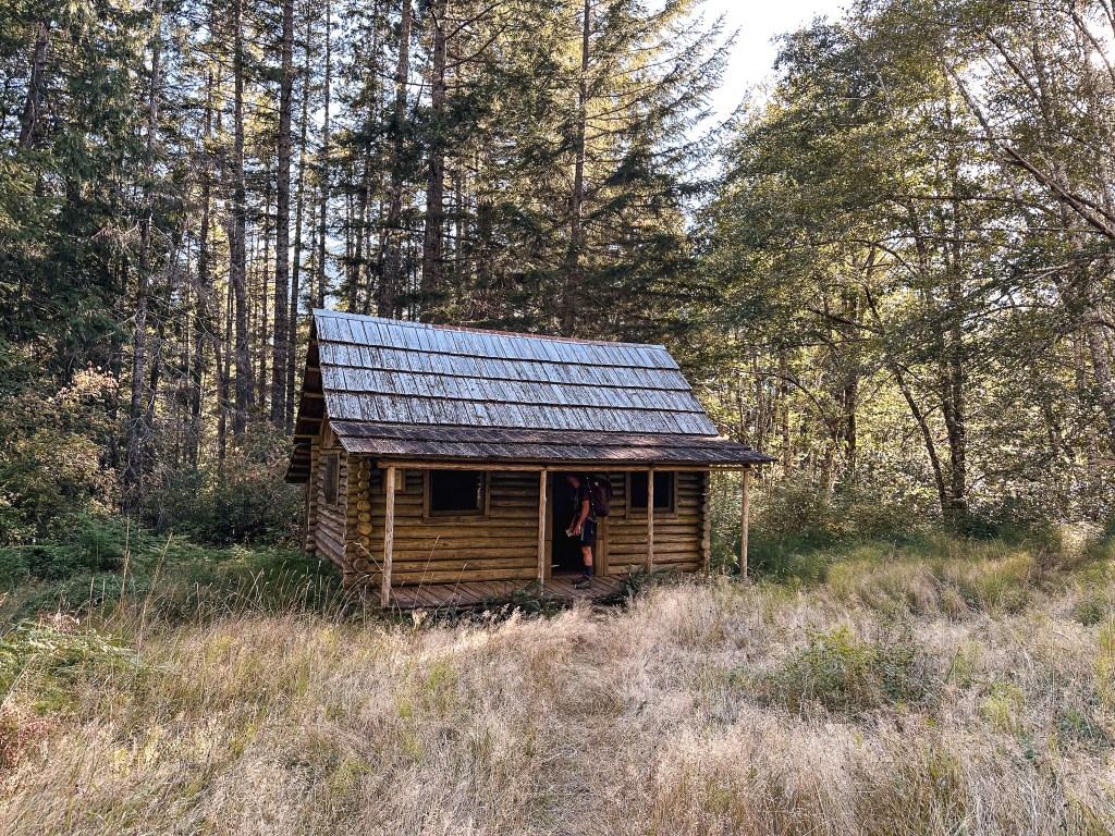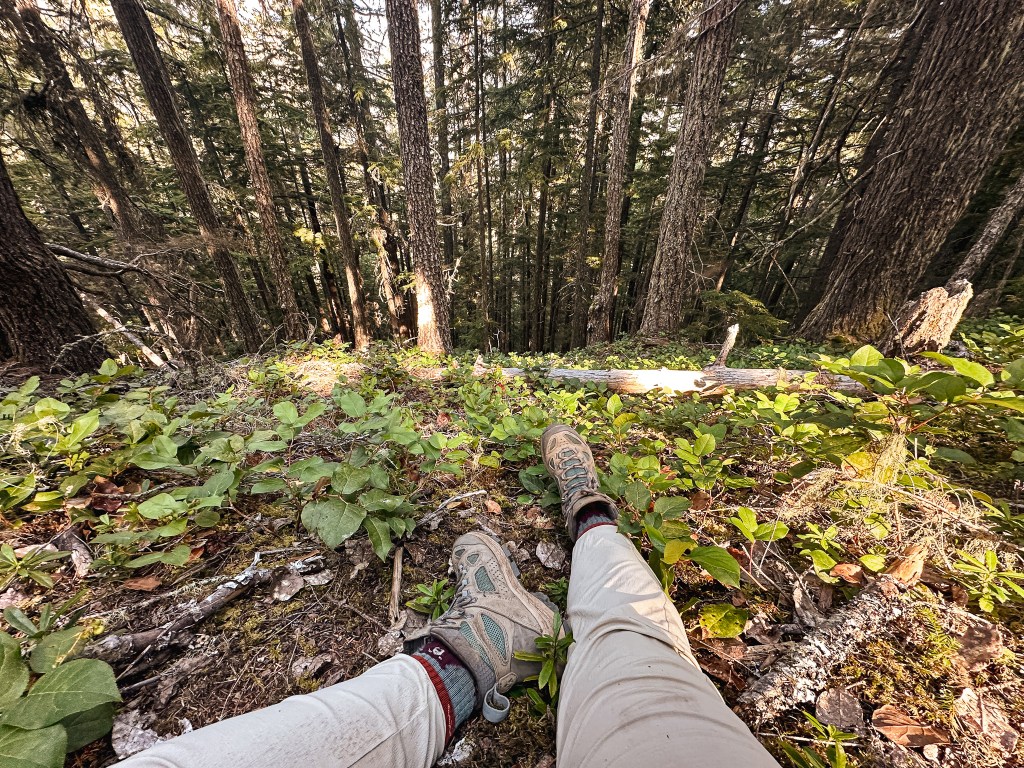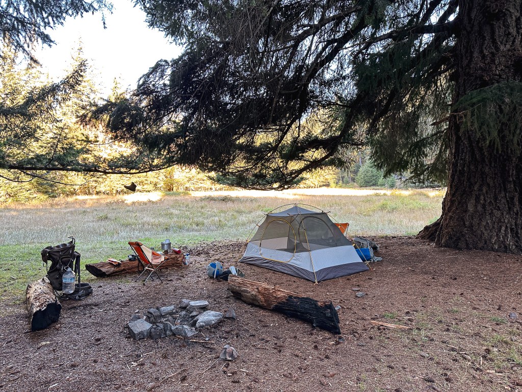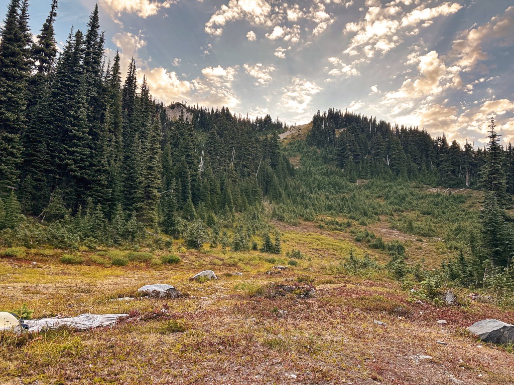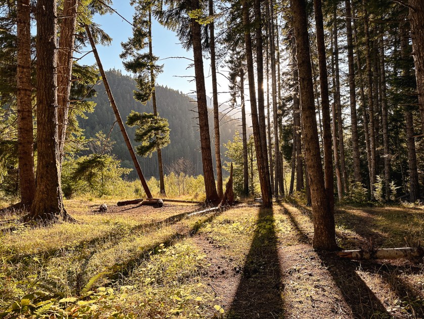 While hiking along the road we were met with a family of grouse, I believe they were Sooty Grouse, that seemed completely unbothered by us. It reminded me of the Spruce Grouse we encountered while in Minnesota’s Boundary Waters in 2022. They did not have the best fight or flight instincts and were willing to get within an arms reach. Garnet fell behind trying to identify them with the Merlin app as I continued ahead. I finally reached the trailhead, sweaty and tired, after 7 miles of road walking. I took off my pack and laid down on the picnic table until Garnet arrived. Road walking can be really hard on your feet. The remaining distance to Humes Ranch was 2-1/2 miles along the official Elwha River trail. There are a few different junctions heading off to the right to note along this trail. The first we came to was an over grown trail that had a sign for an overlook. The second was an obvious junction but was not signed. We debated whether this was our turn or not since the trails all seemed to interconnect on the map. We decided to stay on the Elwha River trail. Looking at a map after the fact, it appears this was the Rica Canyon trail. The third junction we came to was labelled with a sign for Krause Bottom. We figured this might be our junction and even started to head down the trail a bit, but decided to turn around after the tread started to grow faint. Once again looking at a map after the fact, it looks like this would have connected to Humes Ranch but it is not the main route. We continued on the Elwha River trail until we reached Michael’s Cabin. There is an obvious junction here signed for Humes Ranch and Dodger Point. The trail drops down from here to the edges of the Elwha River passing another trail fork for Dodger Point, a cabin from the Humes Ranch, and a junction that connects to Krause Bottom. There is a small camp spot where the trail first meets up with the Humes Meadow, but the main camping area is located across the meadow. We assumed we would see people while we were here since there were more than just our permits taken out for the night. We were surprised to find an empty campground and as the sun started to set we were surprised no one ended up joining us later in the evening. We hadn’t seen anyone else since we left the paved part of the road.