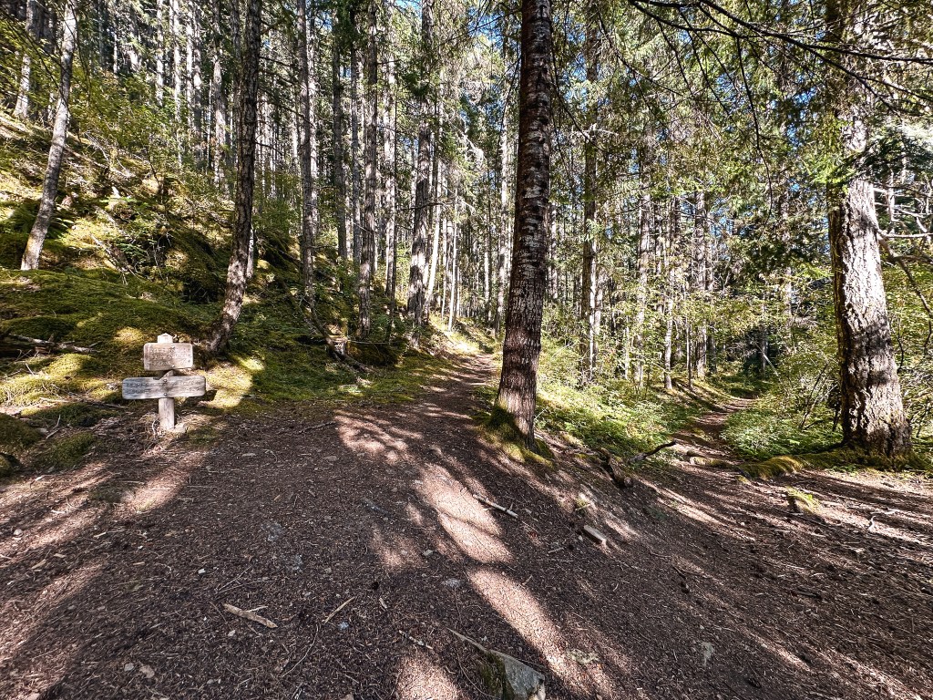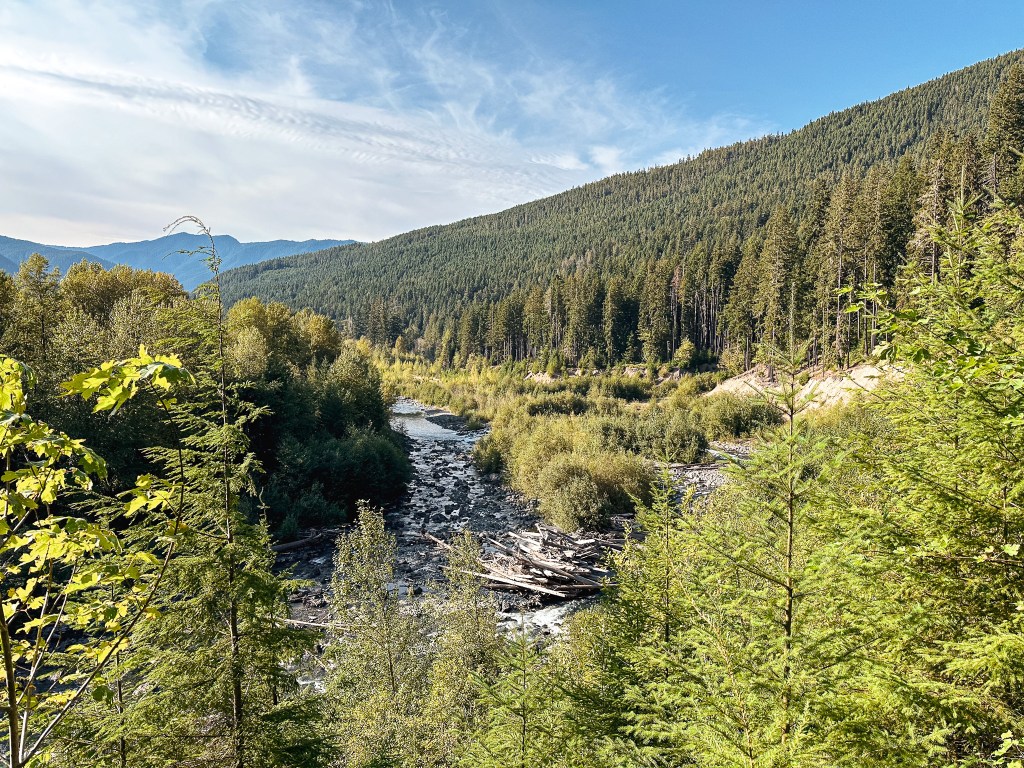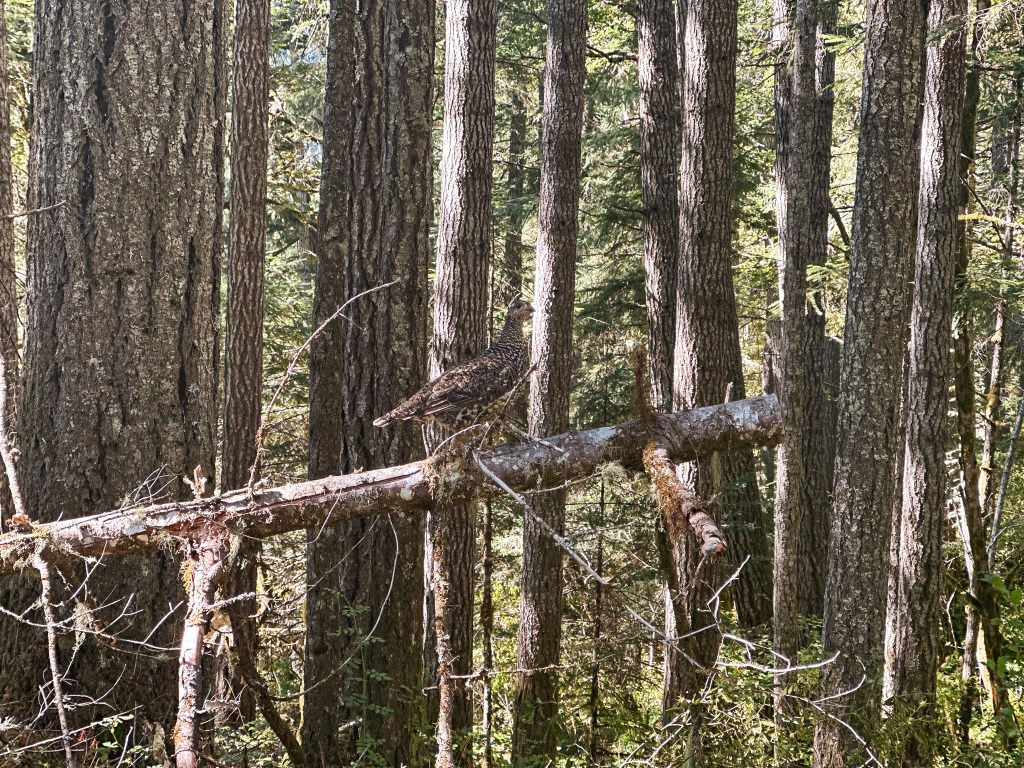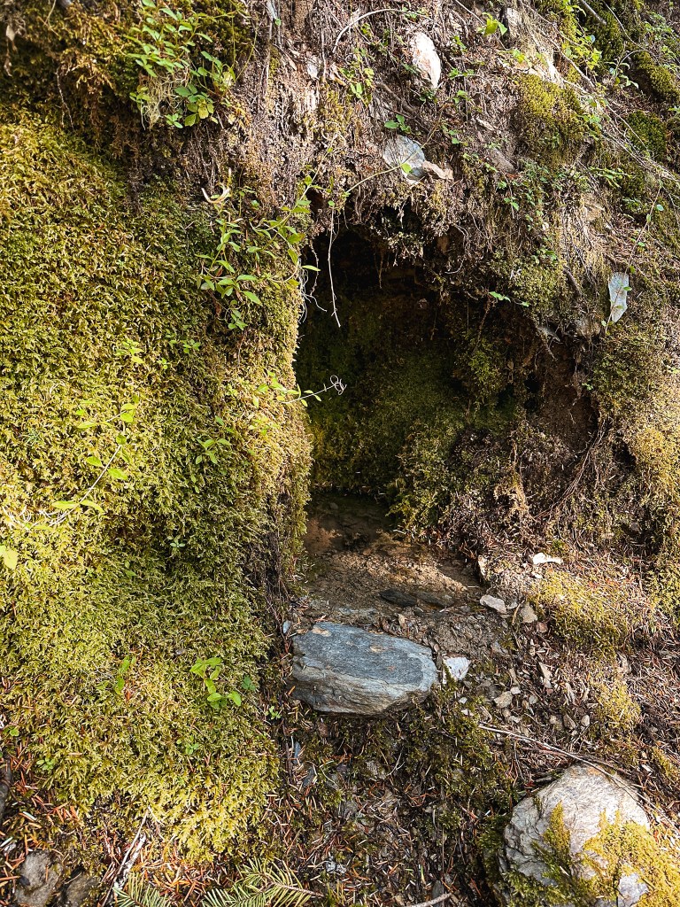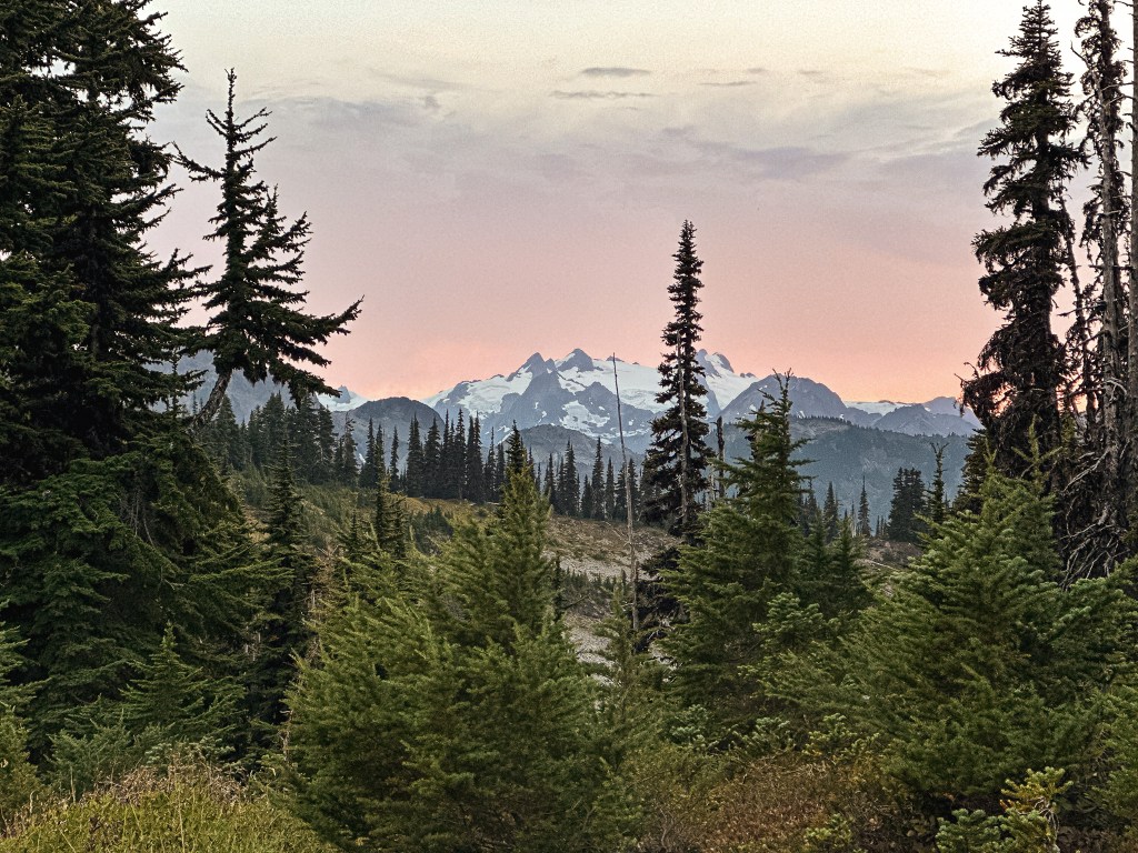 While hiking along the road we were met with a family of grouse, I believe they were Sooty Grouse, that seemed completely unbothered by us. It reminded me of the Spruce Grouse we encountered while in Minnesota’s Boundary Waters in 2022. They did not have the best fight or flight instincts and were willing to get within an arms reach. Garnet fell behind trying to identify them with the Merlin app as I continued ahead. I finally reached the trailhead, sweaty and tired, after 7 miles of road walking. I took off my pack and laid down on the picnic table until Garnet arrived. Road walking can be really hard on your feet. The remaining distance to Humes Ranch was 2-1/2 miles along the official Elwha River trail. There are a few different junctions heading off to the right to note along this trail. The first we came to was an over grown trail that had a sign for an overlook. The second was an obvious junction but was not signed. We debated whether this was our turn or not since the trails all seemed to interconnect on the map. We decided to stay on the Elwha River trail. Looking at a map after the fact, it appears this was the Rica Canyon trail. The third junction we came to was labelled with a sign for Krause Bottom. We figured this might be our junction and even started to head down the trail a bit, but decided to turn around after the tread started to grow faint. Once again looking at a map after the fact, it looks like this would have connected to Humes Ranch but it is not the main route. We continued on the Elwha River trail until we reached Michael’s Cabin. There is an obvious junction here signed for Humes Ranch and Dodger Point. The trail drops down from here to the edges of the Elwha River passing another trail fork for Dodger Point, a cabin from the Humes Ranch, and a junction that connects to Krause Bottom. There is a small camp spot where the trail first meets up with the Humes Meadow, but the main camping area is located across the meadow. We assumed we would see people while we were here since there were more than just our permits taken out for the night. We were surprised to find an empty campground and as the sun started to set we were surprised no one ended up joining us later in the evening. We hadn’t seen anyone else since we left the paved part of the road.