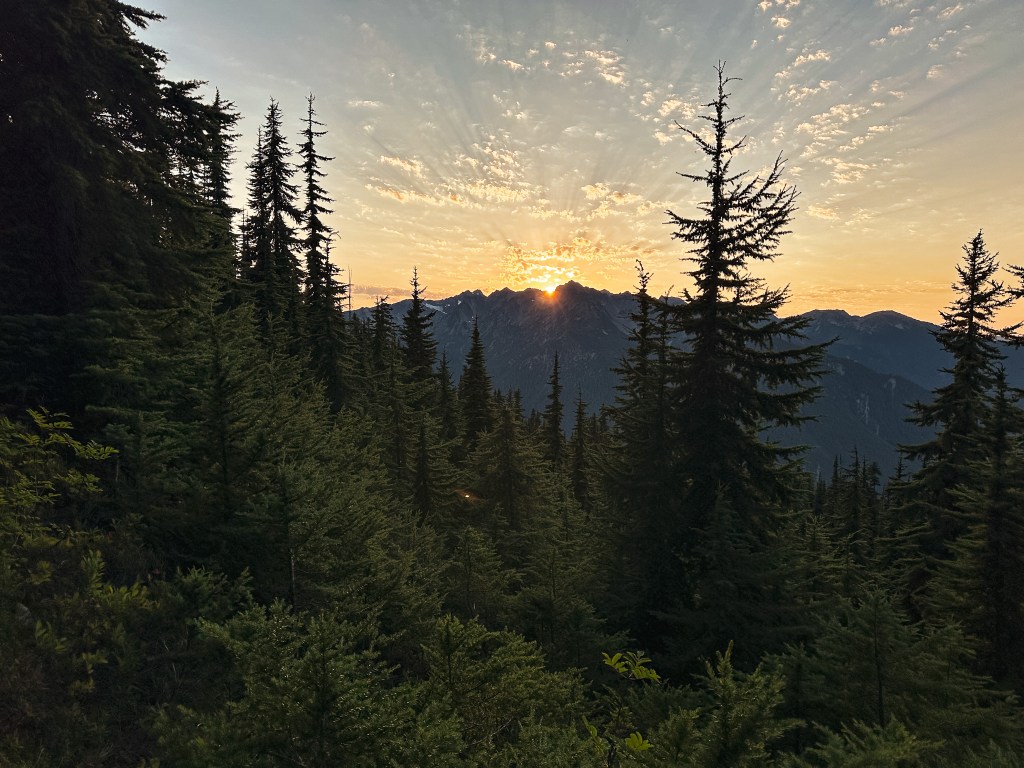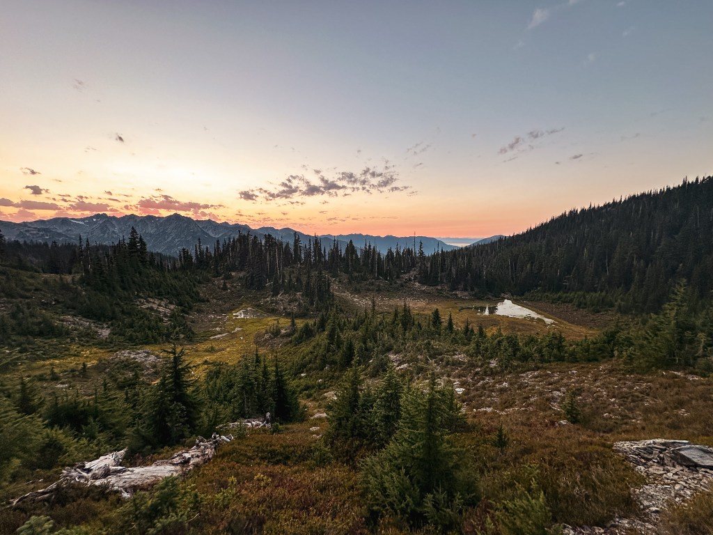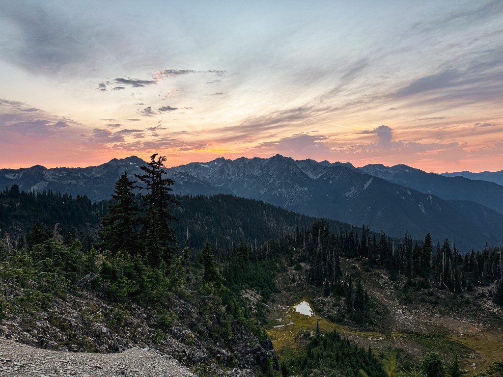 From here, I let Garnet hike ahead since he was carrying the gallon jug for us and I figured I wasn’t going to get there any faster at this point. I continued on with the reminder that today was a marathon not a sprint! The additional water weight stacked on top of the miles for the day started to slow me down and I had to start a mantra in my head to keep my feet moving. I had to keep telling myself that there was still a mile left to go because every corner and downed tree was starting to deceive me of ever reaching our destination. I was thankful that the days still had some length to them otherwise I would have been hiking in the dark. I still came very close as the sun set behind the ridge and I was still hiking at 8PM. I knew I was at least somewhat close to camp as I saw the tarns below that I recognized from many previous trip reports. I started to lose it a bit as I crested the hill beyond into a more open area with no sign of Garnet or an obvious camping area. Garnet eventually spotted me as I was hobbling along the trail and called out to me from behind the trees that obscured my view of the camp. Originally we had hoped to make it up to the lookout today, but any plans of that were thrown out along the Long Ridge trail. I was just happy to make it to camp as my feet screamed at me and the final bits of sunset dropped away. We set up camp and ate our dinner under the light of our headlamps. My body was equal parts stiff and restless as I tried to lay down for the night.