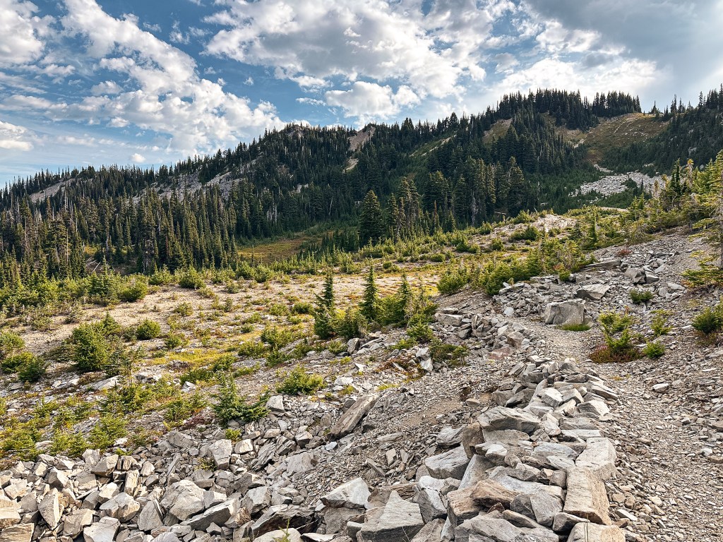 One of my questions were quickly answered as the trail headed steeply down to meet the suspension bridge to cross the Elwha. It’s an impressive bridge. The river crossing would not be possible without it, at least at this section of trail. I crossed the bridge after taking in the impressive flow and drop down to the river. The bounce of the suspension always gives me a bit of anxiety. I paused on the other side and decided to wait a bit for Garnet again. But the longer I waited, the more I felt the pressure of the miles ahead. I continued on with the reminder that today was a marathon not a sprint. The trail turned gently up from here and any signs of erosion where left behind the other side of the bridge. I started to lollygag after every downed tree or mild obstruction wondering “how Garnet hadn’t caught up yet?”. I probably should have just stayed focused on making it farther but my mind always ponders if something could have gone wrong. He caught up to me around 2-1/2 miles into the hike as we continued our way up, up, up. There was a brief section of flat trail as we met a shelf in the ridge. If you look at the topo lines on the map the real climb begins beyond this shelf as you switch back quickly up to the main ridge line. The trail straightens out after this initial climb to make a gradual ascent for the rest of the way. This section is aptly named the Long Ridge Trail as you follow the ridge for what feels like a very, very long time. We stopped to have our lunch around 3:30PM and roughly 6 miles into our hike along the main section of switchbacks. We had been holding out for a decent place to sit but had no luck and eventually just picked somewhere along the trail. At this point we thought we were over halfway to our camp for the night with only a few miles left. Oh how wrong we were. The information I had from online stated that it was only 10-1/2 miles from Humes Ranch to Dodger Point camp. Oh how wrong we were.