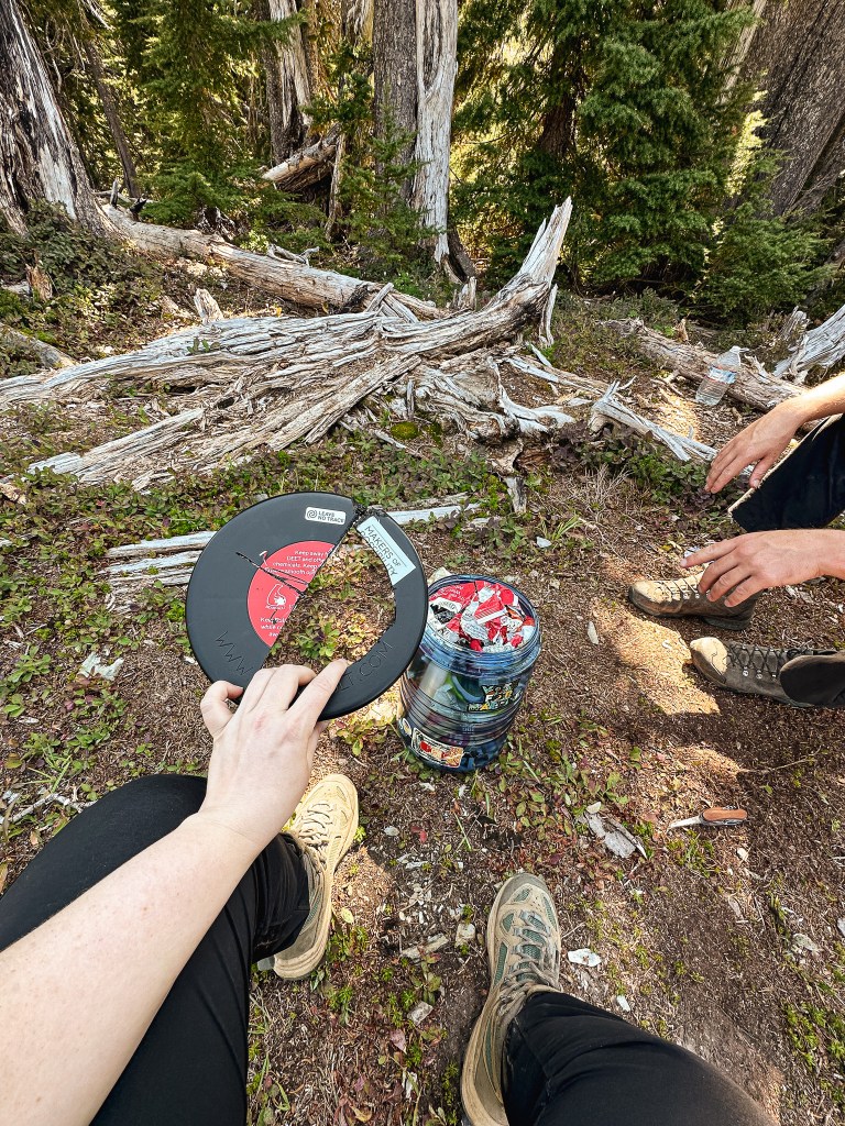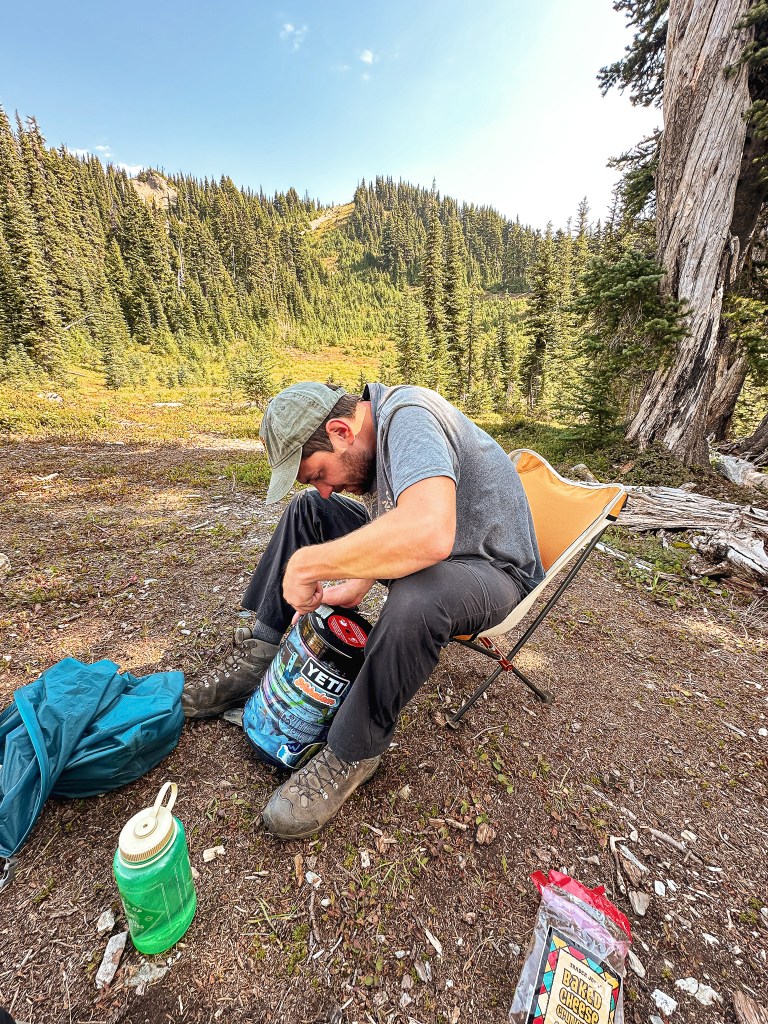 We expected to laze about camp for the remainder of the day; reading, eating, and lounging. And although that was the gist of our day, we were met with an additional complication. The bear canister lid on my BV500 would not open. This was a problem because it contained half of our food for the trip. Garnet is a very strong individual and despite his multiple attempts was unable to get it to budge. I tried too but it is to be expected that I was unsuccessful as well. The solution ended with us sawing off the lid using my multi-tool and finding that it was all due to a well placed chip clip. The bright side was that due to the placement the outcome would have had to happen regardless of where we were located, so it wasn’t a wasted effort. The down side was that it could have been avoided if the chip clip had been placed in a different location before the lid was closed. I was also thankful that I left my multi-tool in my backpack. We normally rely on Garnet’s Leatherman, but it had been stored away in the bear canister as well. This would have left us in a much different predicament. Luckily, we usually overpack our food so there was no danger of us going hungry even if we had been unsuccessful.