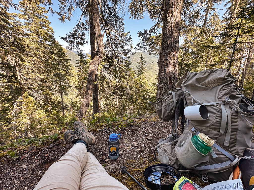 The small section heading up and away from the river felt much steeper than it did when we had hiked down it two days prior. My joints and feet were screaming at me during this final push. The eroded portion of trail felt insignificant now but I still stopped to take pictures. We turned on the connector trail we missed previously leaving camp and were dumped out at the other end of the campground. This trail was much shorter and flatter than the other one we had taken out. We made it to camp a little after 5PM. I had stopped counting the downed trees after I reached 100 but there were definitely more (somewhere in the 106-116 range). We encountered our first person of the day once we reached Humes Ranch. There was one other backpacker camped in the spot we had taken originally. There are a few other spots in the camp ground and we choose the next best one that offered the most amount of privacy. A group of three joined us a couple hours later. We spoke with them briefly about their route and they had hiked across the length of the Olympics from a southern starting point in the same amount of days. We didn’t get a chance to talk with the other backpacker and were unsure if they were starting or ending their journey. I’m always impressed at how much mileage people can cover with what seems like ease. Meanwhile, I feel like I am struggling to convince my joints to make it the 12 miles down hill.