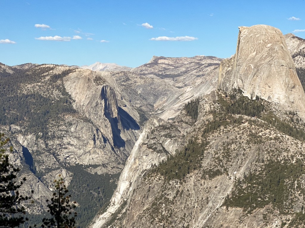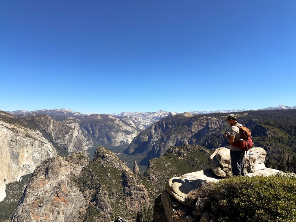 Our fourth day in the park was spent exploring off the Glacier Point road. We decided to do the hike from McGurk Meadows to Dewey Point in an attempt to avoid the crowds. This ended up being a great option as we arrived to an empty trailhead and only saw a handful of people on trail (most were on our way back to the car). It also offered lovely views through forest and meadows before opening up to the valley below. We spent a long lunch enjoying the view and even spotted one of the helicopters in action responding to a fire before hiking out (more than likely deployed from Crane Flat). Strava calculated this at 8.82 miles RT with 1,461′ of elevation gain. We still made the drive out to the end of the road afterwards to see the classic view points, but were quickly driven away by the crowds.