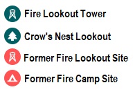 2023: Tillamook Forest Center; East Butte; Green Butte; Quail Prairie; Snow Camp; Wildhorse; Lake O’ Woods; Bald Knob; Pechuck; Aldrich Mountain; Fall Mountain; Prairie City Fire Finder; Dixie Butte; Indian Rock; Desolation Butte; Mount Ireland; Tower Mountain; Johnson Rock; Madison Butte; Tamarack Mountain; Ant Hill; Heybrook (WA); Pine Ranger Station; Summit Point; Apgar (MT); Swiftcurrent (MT); Huckleberry Mountain (MT); Scalplock Mountain (MT); Gobbler’s Knob (WA)