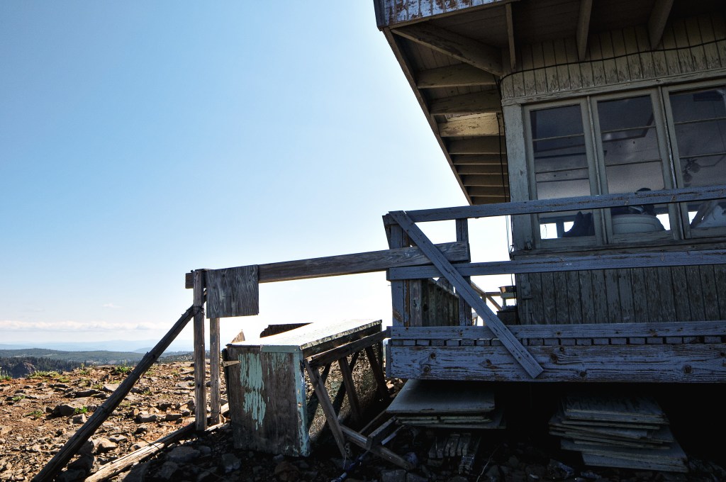 We decided to give her some space to finish breakfast and hiked the rocky ridge out to an overlook point. We spent time picking out surrounding peaks and different fire lookouts we could see from the area. Eventually, we headed back towards the lookout to take some more pictures before heading on. The lookout attendant came out to greet us this time and wanted a redo from our previous interaction. She apologized for possibly coming off rude earlier and for her dog. We apologized for coming too early as well. Everyone agreed no apologies were needed though. We talked for a long time, almost 3 hours, with the lookout about her history in fire lookouts, the different places she’s lived, her rescue animals, and stories of the area. If you’re lucky, you might even get a chance to see the resident mountain goats that frequent the area. They weren’t there during our visit, but she pointed out the damage they had done to her catwalk. She talked about the 2022 Crockets Knob Fire and how close it came to her tower last year. I was surprised to learn she was able to come back to finish off her season in September after it had been mostly contained. This fire was also the reason the road had been in such good condition. They already had all the equipment onsite for the fire and decided to do the much needed road maintenance while they had the time. I guess prior to this it was a long rocky road that took an hour and a half to drive even in a truck. It’s a good thing we didn’t attempt to drive it in 2020. She also talked about how lookouts will stay on the same fire lookout when they feel they have found their mountain. Indian Rock was her mountain and she believed Stacy on Dixie Butte (post) had also found her mountain there. She reconfirmed that no one was staffing Mt. Ireland (post) for the season yet, but they hoped a previous long term staffer might return in the future. We eventually had to find a break in the conversation since we still needed to pack up our camp and head on to Desolation Butte (post). It was already past noon and we needed to hurry if we wanted to stay on schedule. We thanked her for her time and headed on to our next destination.