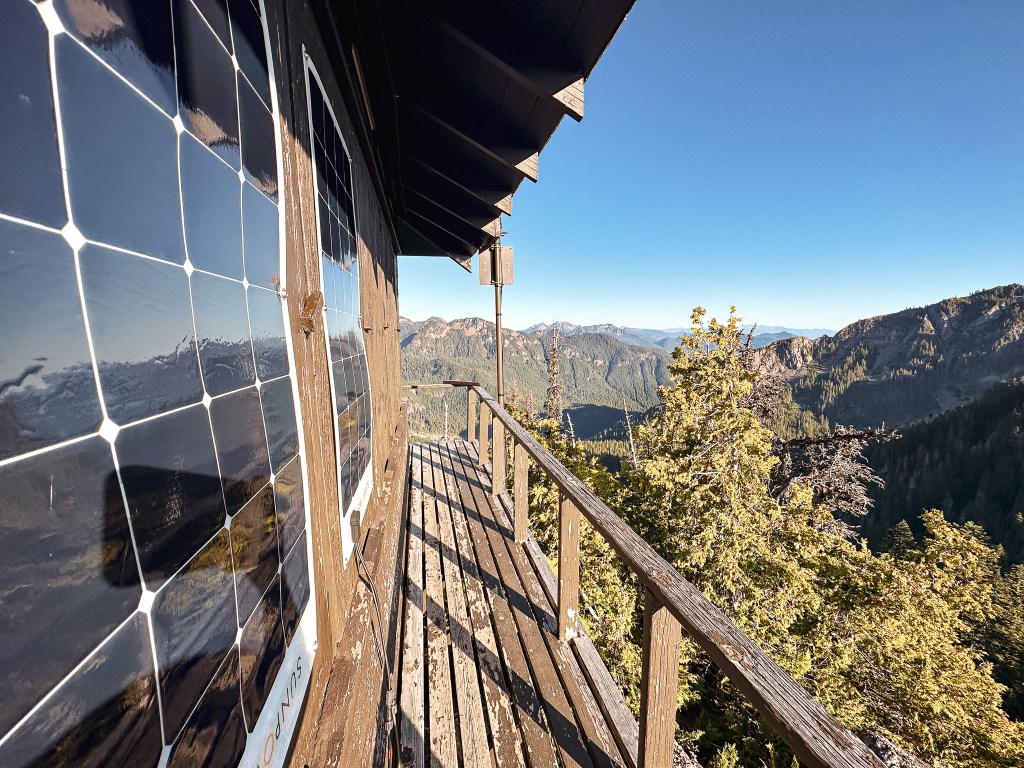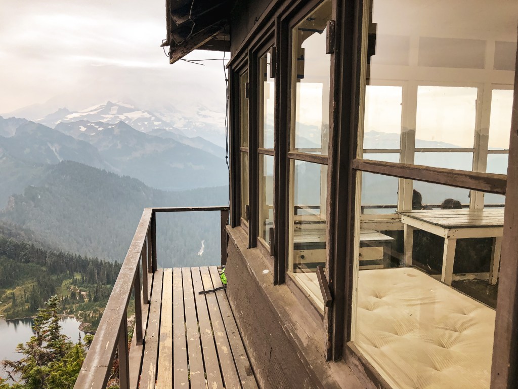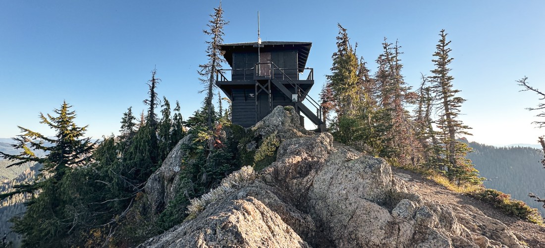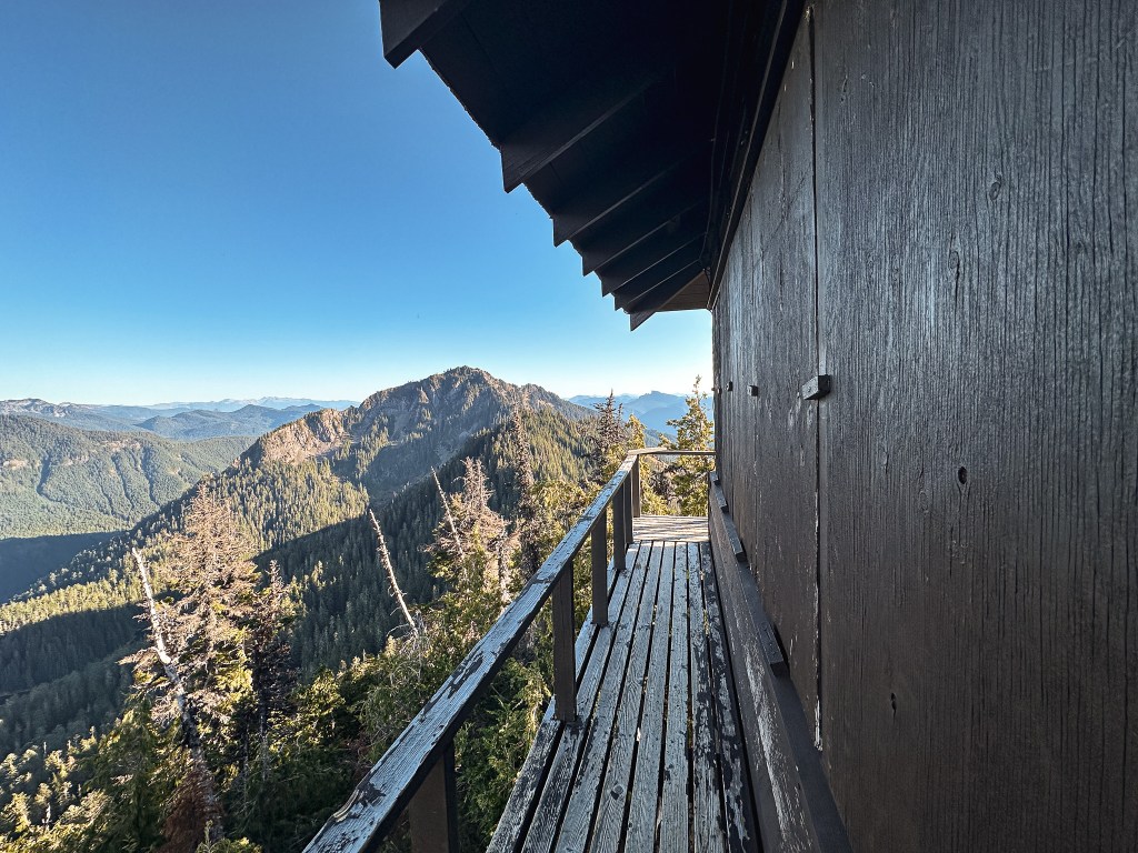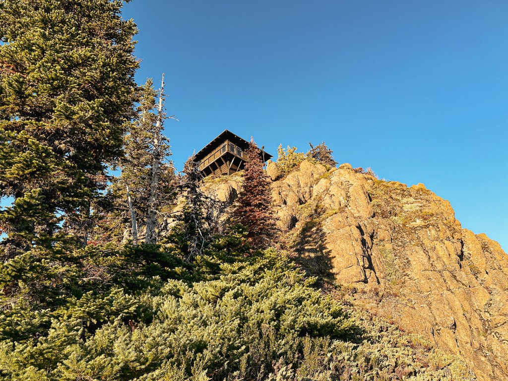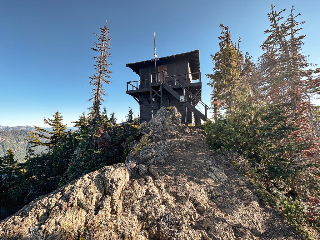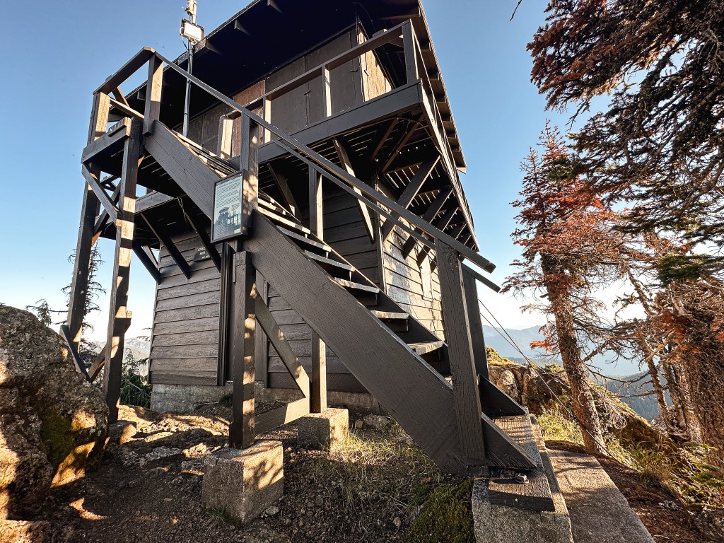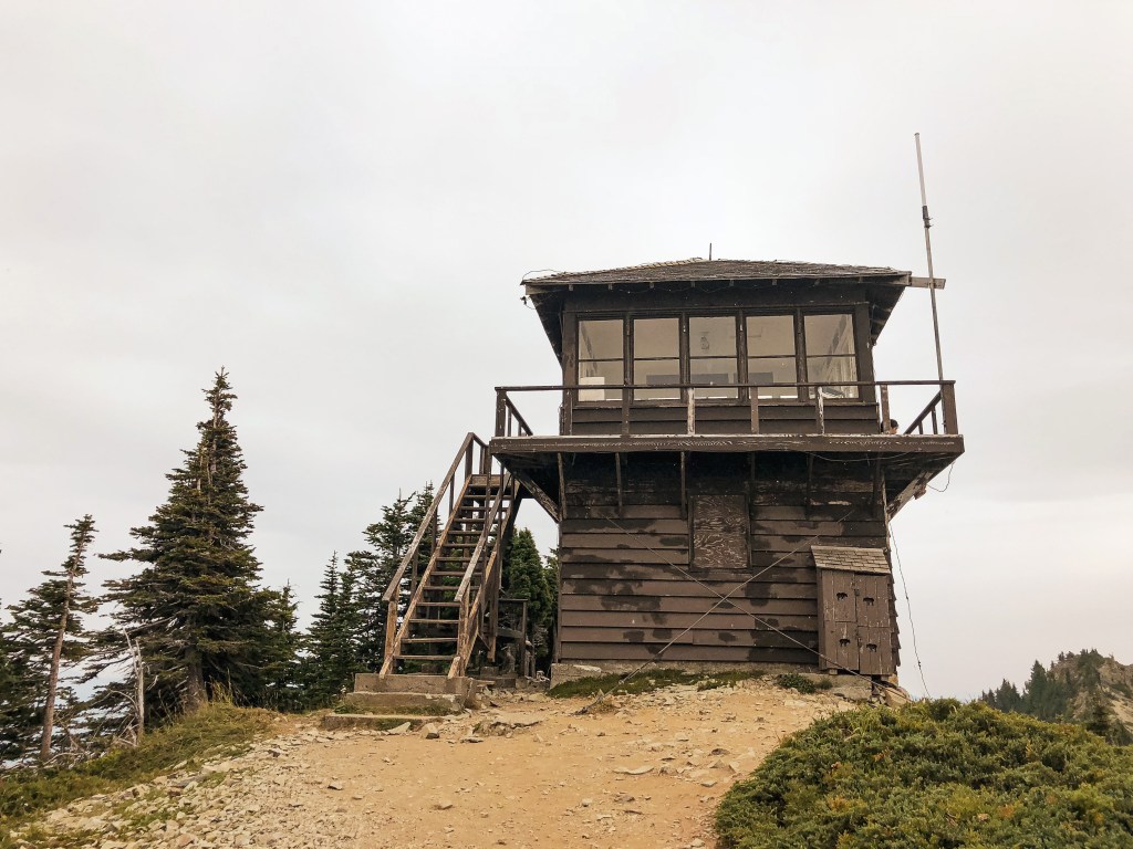 We were surprised to find all the camp spots were empty when we reached Lake George and had our pick of the five. We only passed one group of four day hikers hiking out and were left wondering where the heck everyone was? Were they all at the fire lookout? Did they hike farther into the Goat Lake Wilderness? At this point, I knew the road continued to other trails which explained the amount of cars but why were there so many bikes at the trailhead and so few people on this trail? We decided to set our speculations aside for awhile to pick our camp spot for the night. We both agreed on number 4 since it was the farthest spot to the back and offered the most amount of privacy from the other camps. This was strategic since we knew we’d be joined by at least two other groups later in the day (potentially more if people snagged the walk up permits as well). After our stake was claimed and lunch was devoured, we felt re-energized to continue our ascent to the fire lookout. You gain most of the elevation during this hike within this last 1.6 miles from Lake Georg to Gobblers Knob. We kept our loads light by leaving most of our gear in camp for the remainder of the hike. I only brought my valuables (i.e. car keys, wallet, phone) in a fanny pack, a warm puffy layer, headlamp, a 32oz Nalgene, and my trekking poles. We passed a couple of day hikers coming back from their visit to the fire lookout and asked them if anyone else was currently up there. They said they had it to themselves and were wondering where everyone else was as well (they too mentioned a full bike rack). So, the mystery continues. We were excited at the potential of having the summit to ourselves though. This section was slow going since my body was still feeling the fatigue of hiking in Glacier NP. There are not too many views to expect from the trail since it is mostly treed until you get closer to the summit. But eventually your slog ends, you round that corner, and the views open up. And what a spectacular view it is.