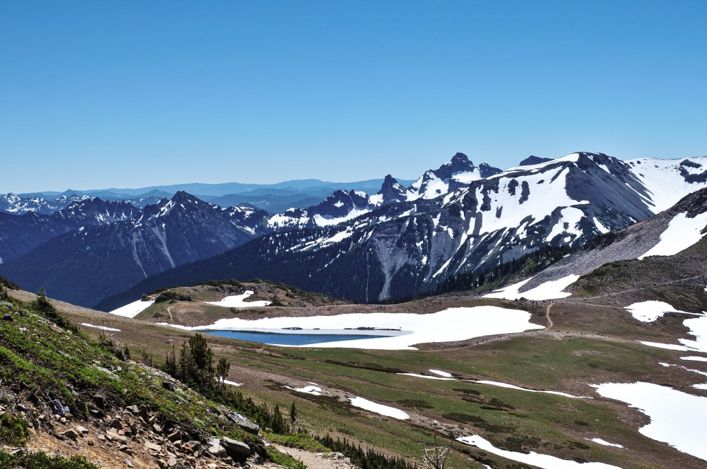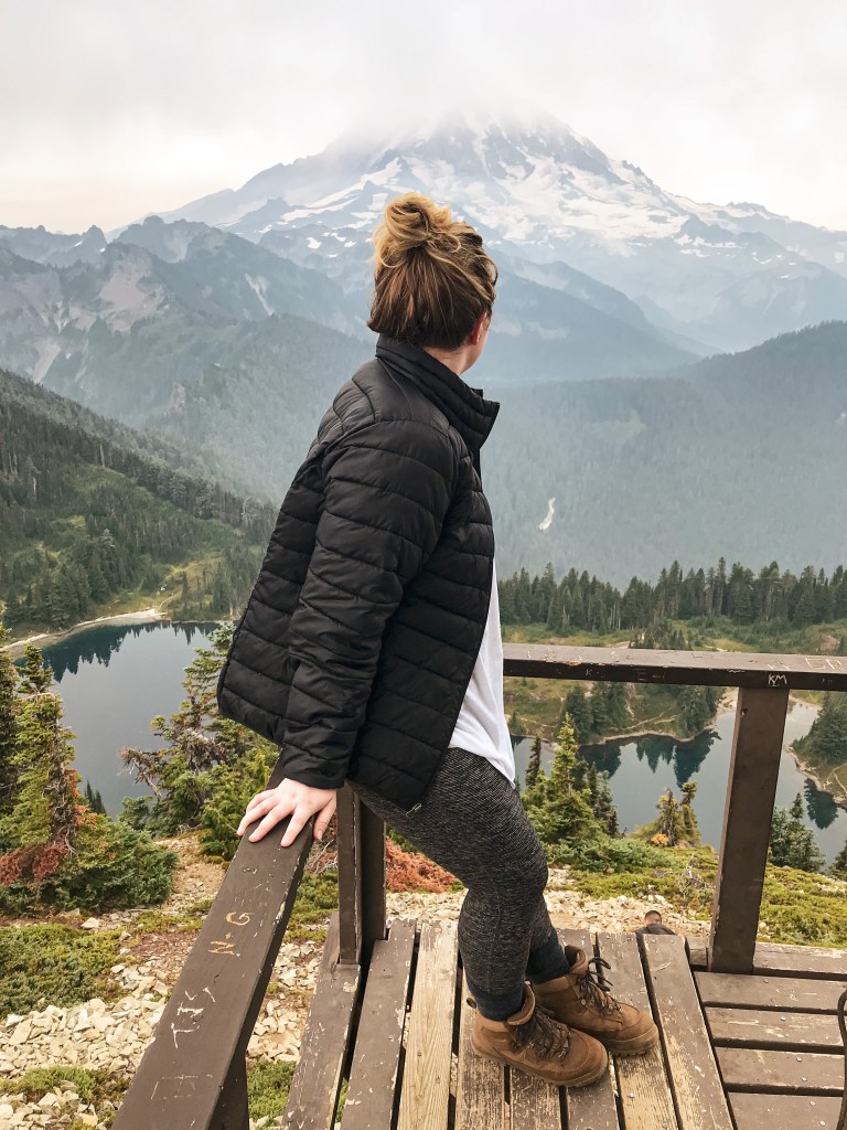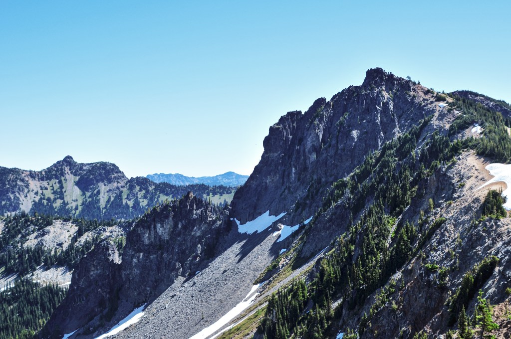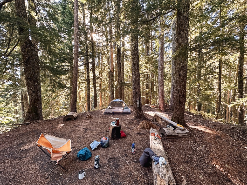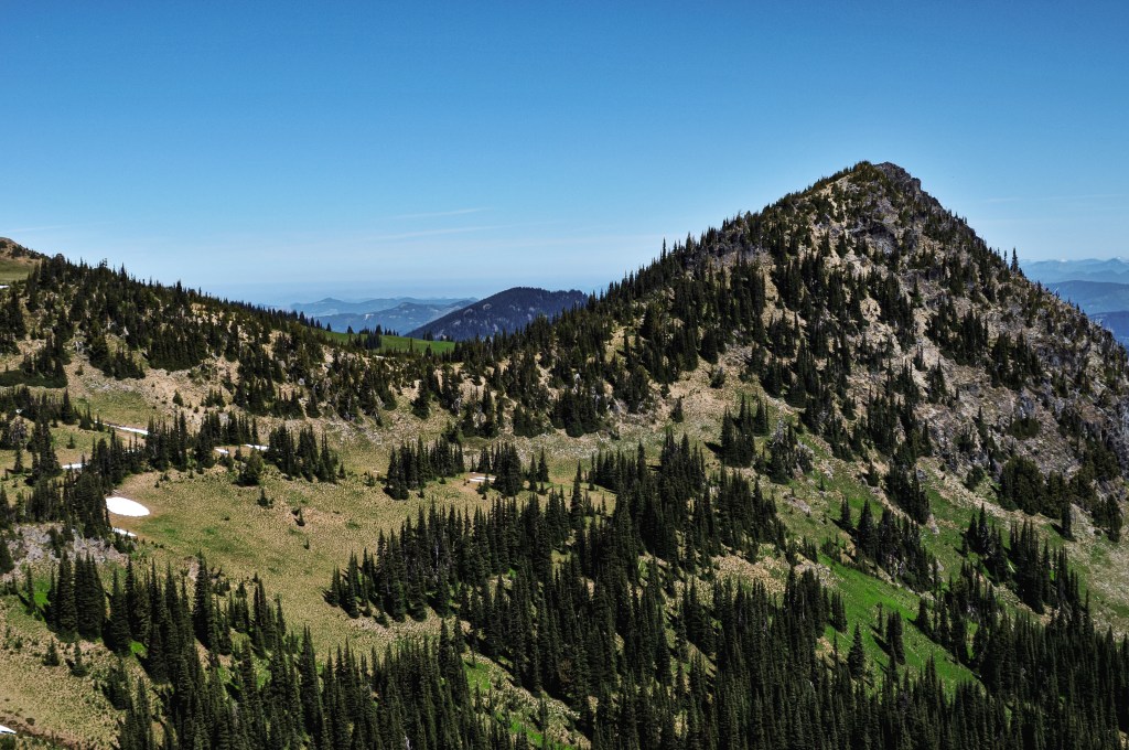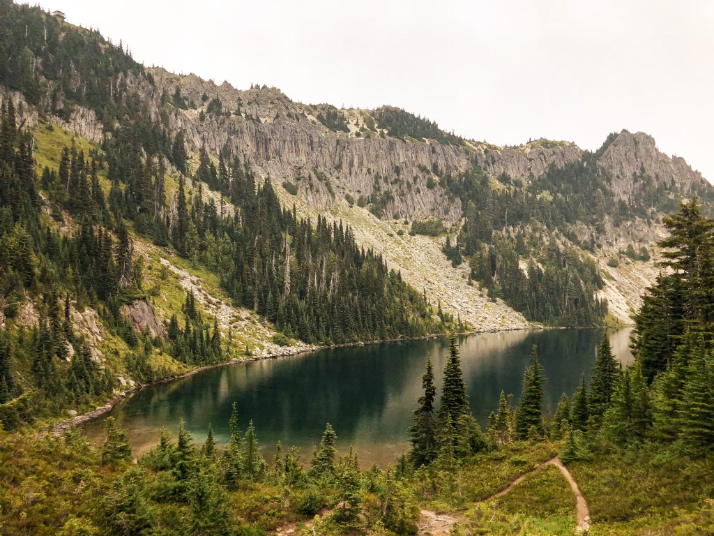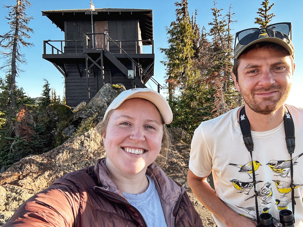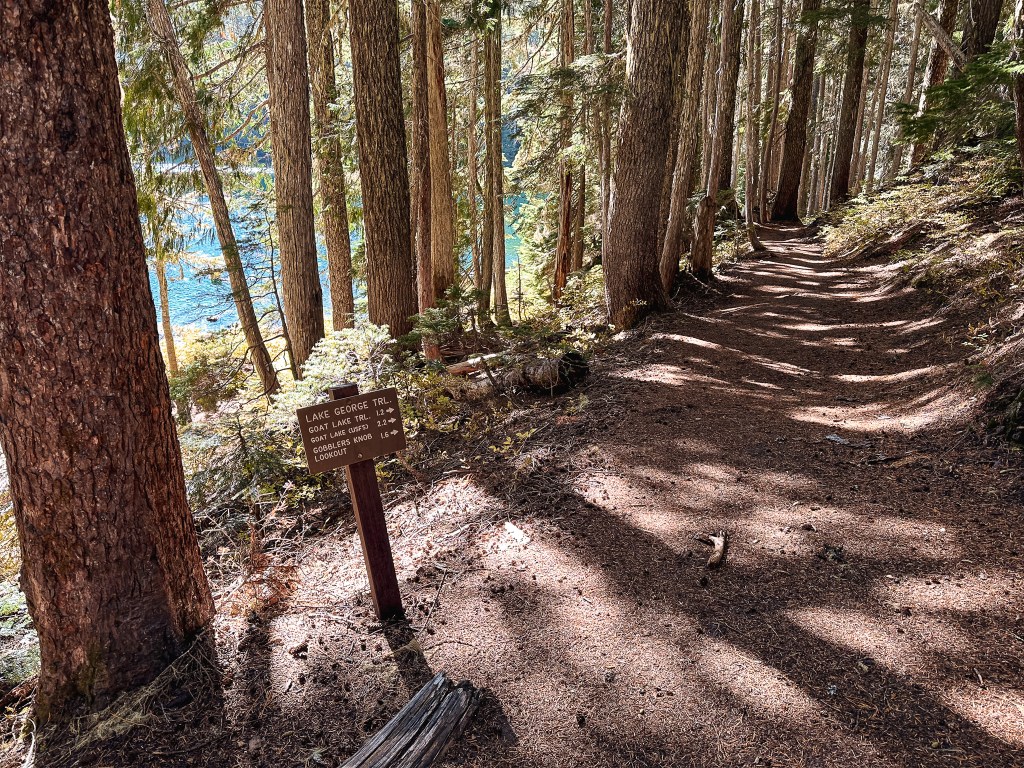We were surprised to find all the camp spots were empty when we reached Lake George and had our pick of the five. We only passed one group of four day hikers hiking out and were left wondering where the heck everyone was? Were they all at the fire lookout? Did they hike farther into the Goat Lake Wilderness? At this point, I knew the road continued to other trails which explained the amount of cars but why were there so many bikes at the trailhead and so few people on this trail? We decided to set our speculations aside for awhile to pick our camp spot for the night. We both agreed on number 4 since it was the farthest spot to the back and offered the most amount of privacy from the other camps. This was strategic since we knew we’d be joined by at least two other groups later in the day (potentially more if people snagged the walk up permits as well). After our stake was claimed and lunch was devoured, we felt re-energized to continue our ascent to the fire lookout. You gain most of the elevation during this hike within this last 1.6 miles from Lake Georg to Gobblers Knob. We kept our loads light by leaving most of our gear in camp for the remainder of the hike. I only brought my valuables (i.e. car keys, wallet, phone) in a fanny pack, a warm puffy layer, headlamp, a 32oz Nalgene, and my trekking poles. We passed a couple of day hikers coming back from their visit to the fire lookout and asked them if anyone else was currently up there. They said they had it to themselves and were wondering where everyone else was as well (they too mentioned a full bike rack). So, the mystery continues. We were excited at the potential of having the summit to ourselves though. This section was slow going since my body was still feeling the fatigue of hiking in Glacier NP. There are not too many views to expect from the trail since it is mostly treed until you get closer to the summit. But eventually your slog ends, you round that corner, and the views open up. And what a spectacular view it is.