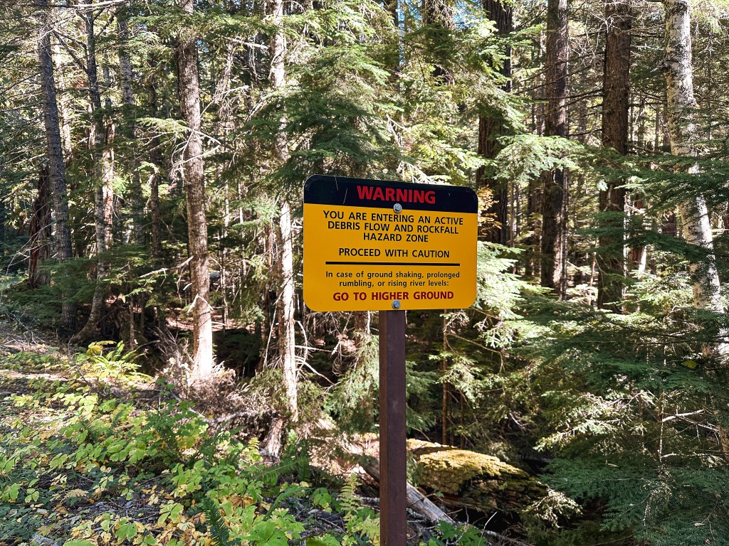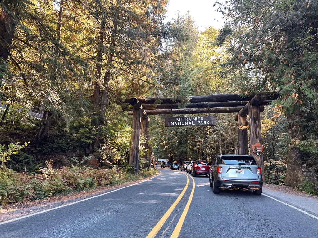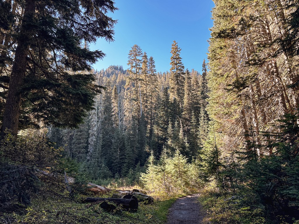 We planned to pick up our permit from the Longmire WIC since it wasn’t closing for the season until October 10th. This is just shy of a 3 hour drive from Portland depending on traffic. We knew this meant we would need to get an early start and set our alarms for 5:45AM. Our wheels didn’t hit the pavement until 7:30AM though, since we wanted to make a hearty breakfast and needed to button up things around the house. We set out via I-205 to I-5 to connect to HWY-12 and cut up via HWY-7 to eventually get to HWY-706 that would take us to our needed entrance of the park. By the time we reached Ashford, we realized everyone had a similar idea to us. October is supposed to be a time of the year when hiking trails settle down and get less use, but the unseasonably warm weekend brought everyone out for one last hoorah (ourselves included). The forecast called for clear skies and temperatures somewhere in the 70-80 degree range depending on what elevation you were situated. We joined the assembly line of vehicles and waited for our turn at the kiosk. I know Mount Rainier is a popular National Park, but after seeing the entrance back up at 10AM in October I can’t even fathom how the summer lines compare. As the line crept on at a snails pace with no entrance in sight, we started to get worried we wouldn’t make it through before our noon deadline. We debated calling the ranger station, but had spotty service near the entrance. Luckily we did end up making it through just fine after a 30-40 minute wait, but it’s definitely something one should factor in to their travel time. Once in the park you will still need to drive a little ways past the entrance to get to Longmire. We even passed the turn to access the trailhead and had to back track after picking up our permit. The WIC was easy to find and was one of the farthest buildings to the left of the lodge. Something else to note is this backcountry campsite requires you to use their bear hang or a bear canister. We were aware of this but didn’t bring our bear canister with us since it said online the bear pole was usually up until there is snow on the ground. The ranger informed us due to how late in the season it was the pole had already been removed for winter and offered to let us check out one of their bear canisters for the night. The National Park offers these for free to check out as long as their supplies last. You only need to provide a drivers license to obtain this. Once again something to keep in mind if you’re visiting in the off season. Now with permit and bear canister in hand, we headed for the trailhead.