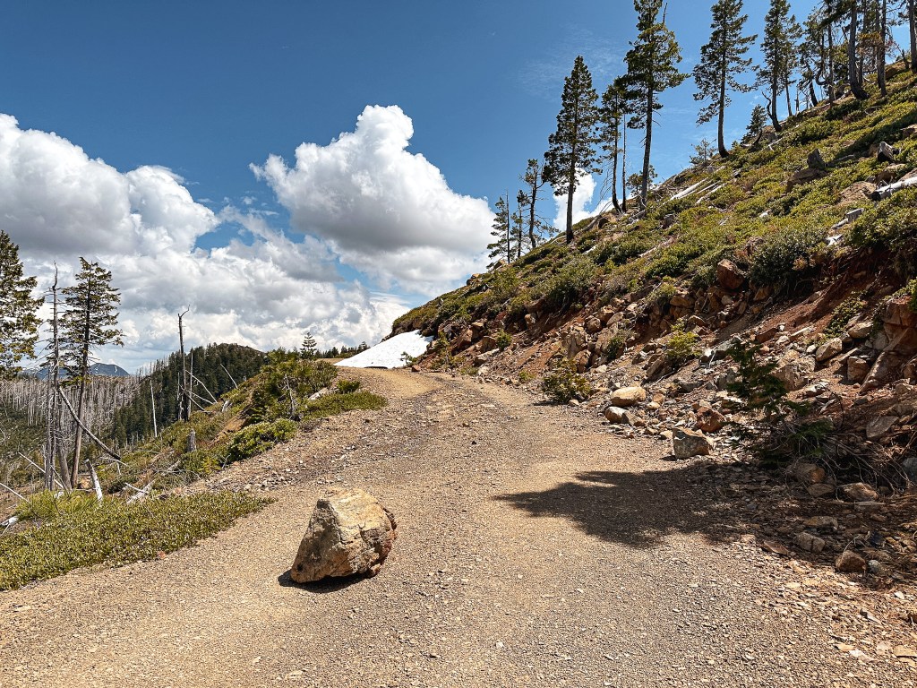When we came to the junction with NF-3340, the road looked narrow and headed up steeply from NF-33. It also appeared to be much less traveled than the other signed road we had passed. I was still convinced otherwise and made the sharp left turn. I was getting a bad feeling that we were not where we should be the farther we climbed up the road. It was covered in tree debris and some rocks, but that’s not necessarily uncommon for a lookout road. What didn’t sit right with us was that it didn’t look well traveled enough for a lookout on the rental program. Honestly, It really didn’t look traveled at all. We decided to turn around when we were met with a large drop in the road. This was a blind drop that would’ve been treacherous if we had not stopped to get out and look at it. We might have been able to maneuver around it, but beyond I could see the road turned sharply up at a steeper angle than the road had already been. Everything about this felt wrong and we decided to try our luck with the NF-3336 road. It at least had a sign for the fire lookout.