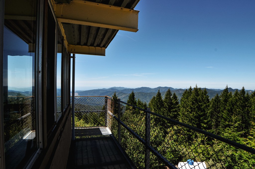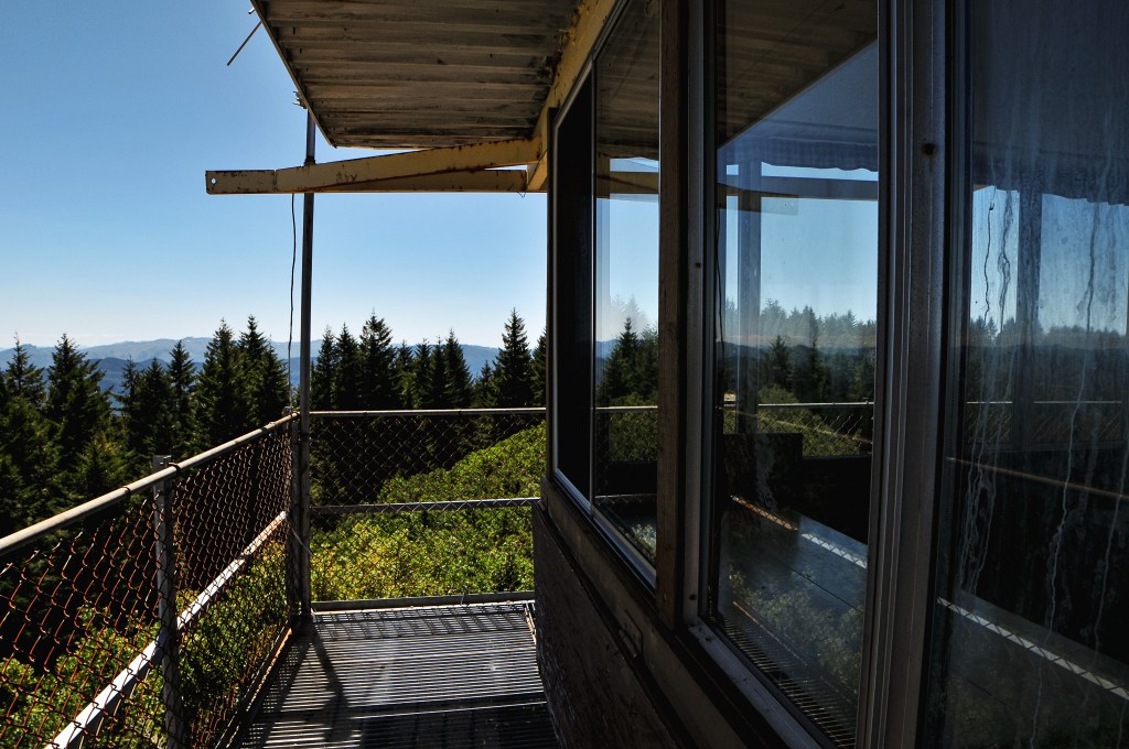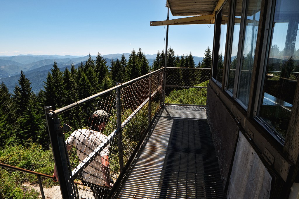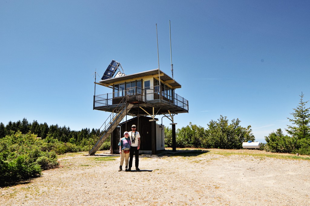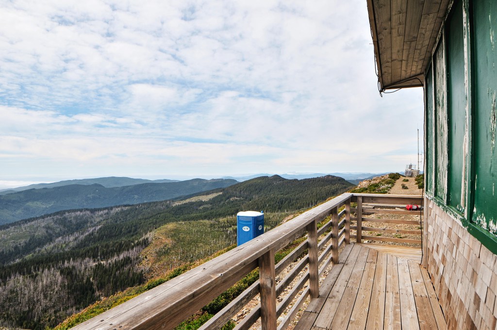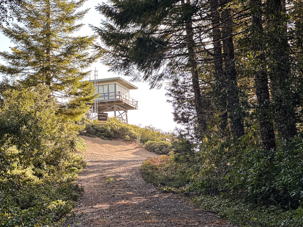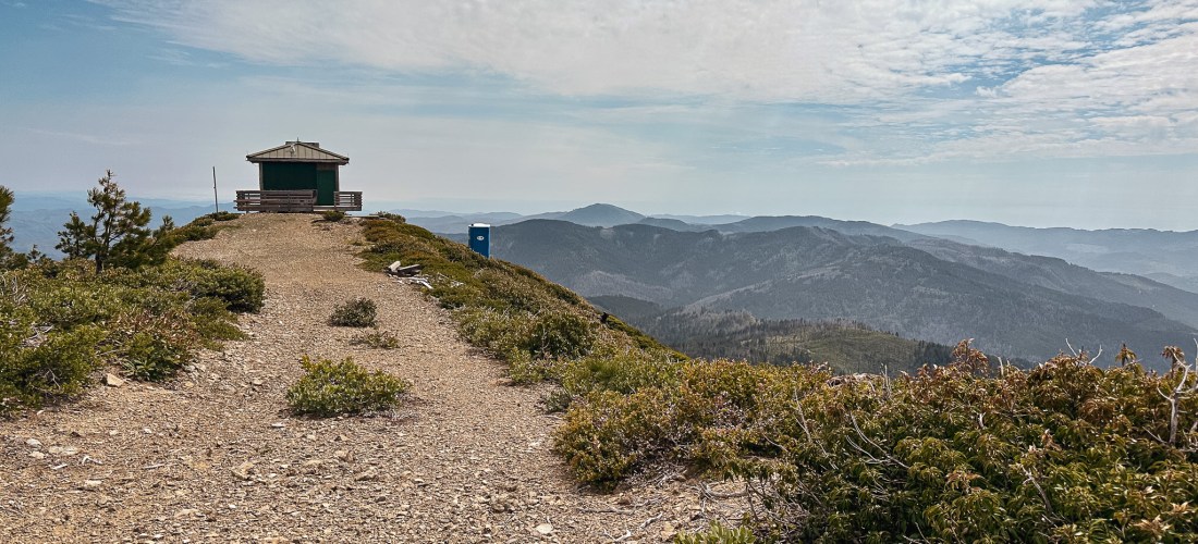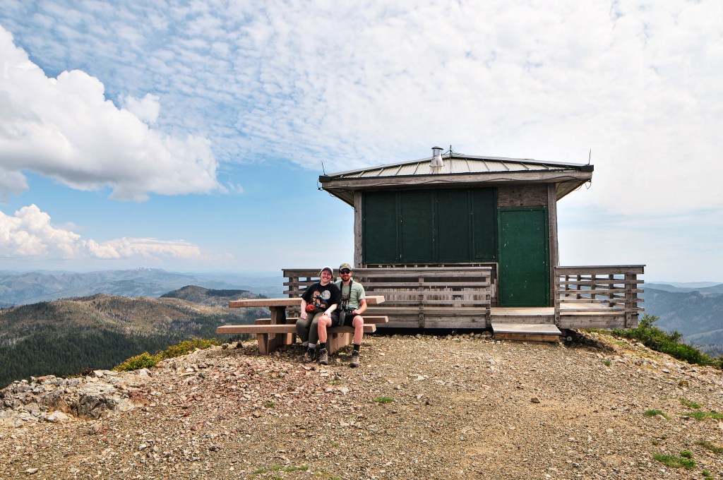 The road beyond the gate was in fairly good condition minus the final pitch towards the tower which would be hard to navigate in a lower clearance vehicle. We almost felt like we were on the wrong road as it started to head down before heading up again. It feels like a trick anytime a lookout road angles down instead of up since you’re usually aiming for the highest point. We reached the summit before the group of four. I guess the teen they had in tow slowed them down. I’m usually the slower hiker in comparison to most. There was also no vehicle here indicating that there were no renters or they had already left for the day. We quickly decided to try and get the pictures we wanted first before anyone else joined us. Afterwards we settled in to eat our lunch in the shade of the catwalk. It was too hot to sit at the picnic table directly in the sun. There was no trap door to block it off from access and luckily no renters were onsite for us to disturb. We called out a hello to double check before we climbed the tower. If there had been renters, we would have found a different lunch spot. The lookout itself might be on public land, but the structure is being rented out for private use.